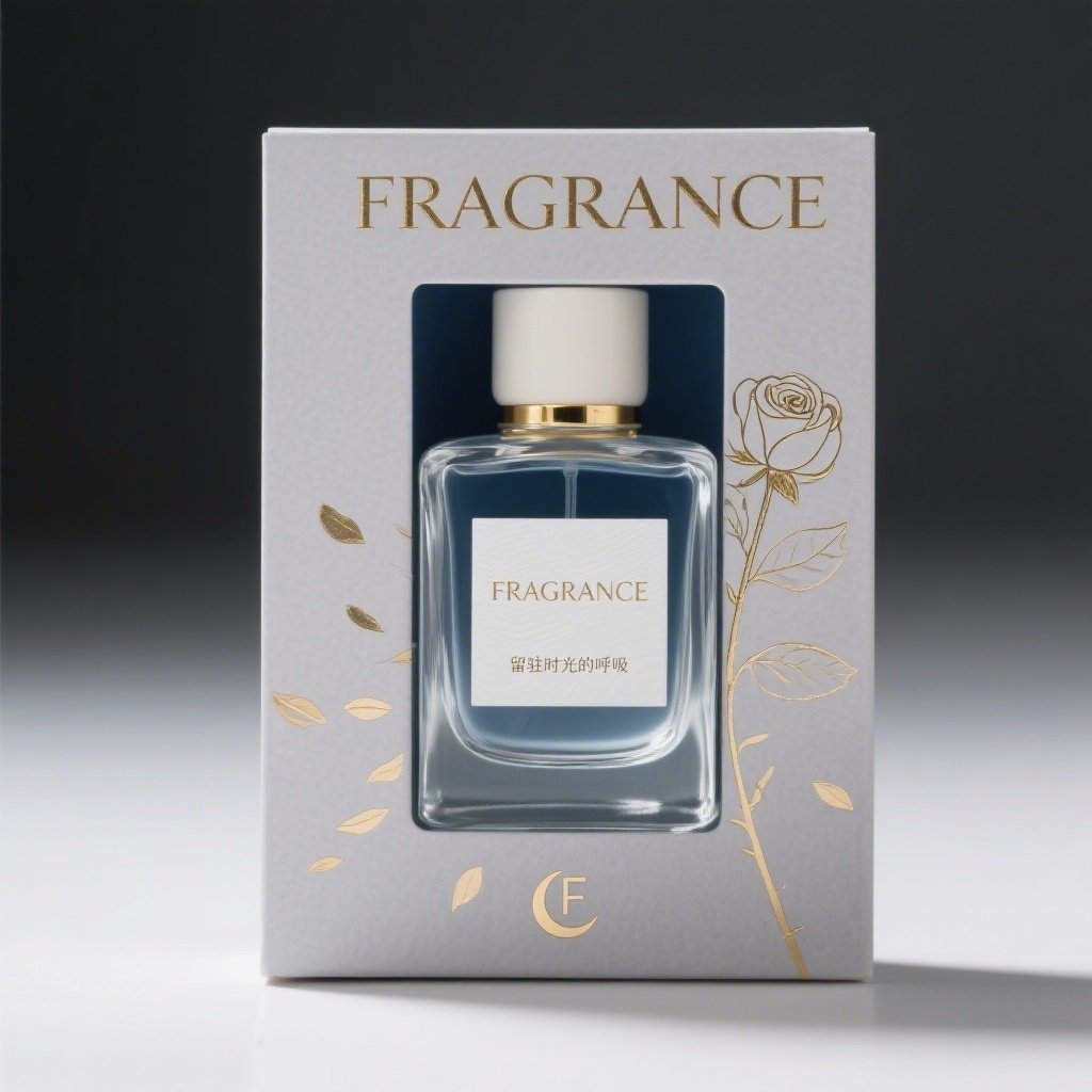 - **包装主视觉面排版**:覆盖式排版(品牌名“FRAGRANCE”以粗衬线体横向居中置于瓶标中央,下方衬以抽象花瓣飘散图案,文字通过哑光白底色块轻微浮凸突出,视觉焦点集中于品牌名称,图案作为氛围烘托不喧宾夺主)