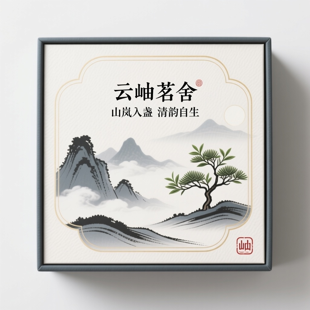 - **包装主视觉面排版**:上下排版(文字在上图案在下)——顶部1/3区域居中排布品牌名“云岫茗舍”与宣传语“山岚入盏 清韵自生”,采用竖排书法字体增强文化感;底部2/3区域为写意水墨山峦与云雾缭绕的茶树插画,视觉重心下沉营造稳重雅致氛围,图文比例协调,留白透气。