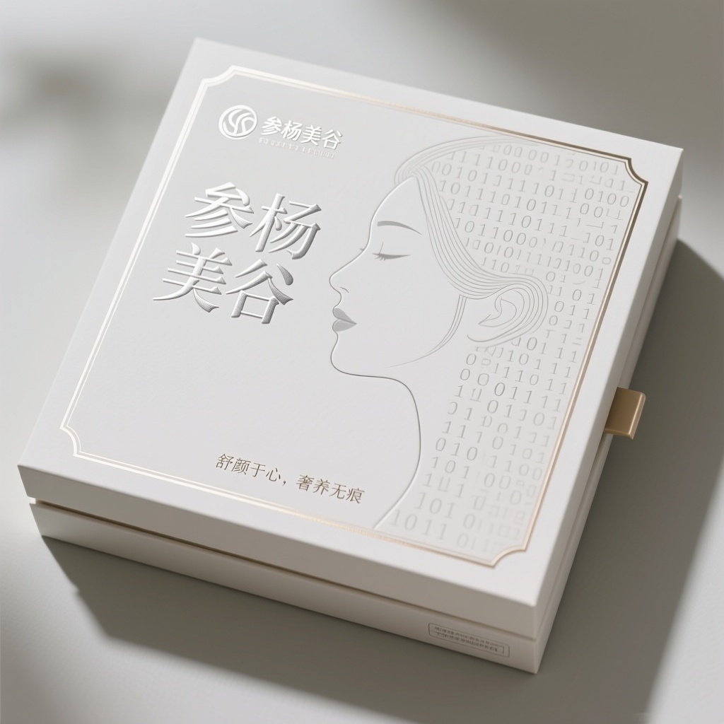 - **包装主视觉面排版**:以文字为主式排版(主标题“参杨美谷”居中放大,采用击凸烫银工艺立体呈现,视觉焦点集中于品牌名;创意代码构成的侧脸图案以极细线稿形式浅灰透叠于背景层,形成若隐若现的数字艺术纹理,底部辅以“舒颜于心,奢养无痕”宣传语小字横向排列,整体留白充足,层次分明)