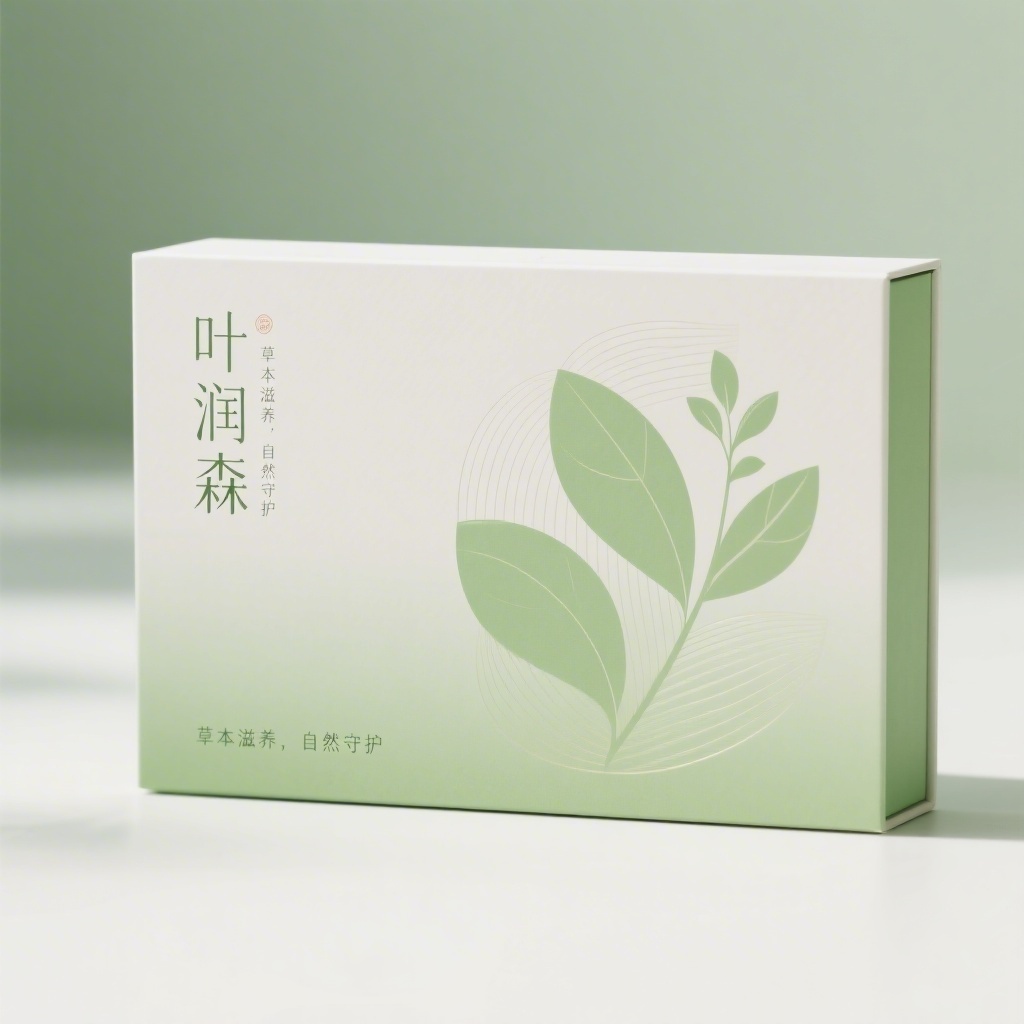 - **产品**:天然草本保健品 - **品牌名及宣传语**:叶润森 草本滋养,自然守护 - **包装样式**:礼品盒 - **包装主视觉面排版**:左右排版,品牌名与宣传语位于左侧,以精致字体纵向排列,右侧为抽象草本叶片图案,视觉侧重天然与平衡感 - **设计风格**:现代简约,自然清新 - **设计元素**:柔草绿渐变背景;抽象叶片组合主图案;细线勾勒的装饰线条;微光质感纸材 - **主题配色**:柔草绿、暖白