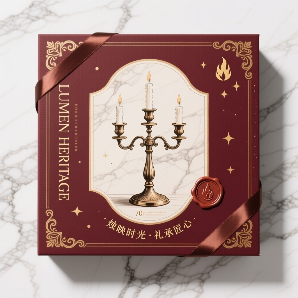 - **包装主视觉面排版**:以商品为主式排版(中央大幅展示精致复古烛台实物摄影或手绘插画,占据视觉焦点70%面积;品牌名“LUMEN HERITAGE”以衬线字体垂直排列于左侧边缘,副标“烛映时光·礼承匠心”以小字弧形排布于烛台底部光影处,右上角点缀火焰徽章与烫金星点装饰)