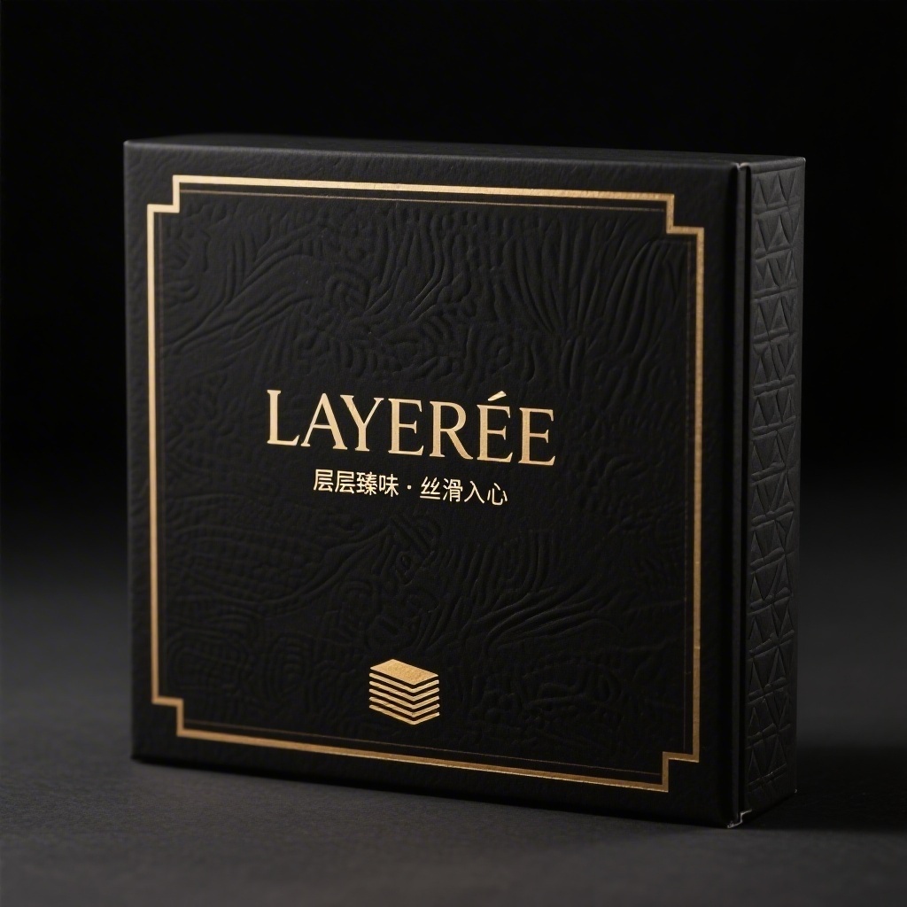 - **设计元素**:哑光黑底纸基+局部烫金工艺;主视觉区仅保留品牌名与宣传语,无具象图案;四角压印极细金色几何边框线;背面底部嵌入微型金色层叠线条图标象征“千层”结构;侧面压印品牌首字母浮雕暗纹。