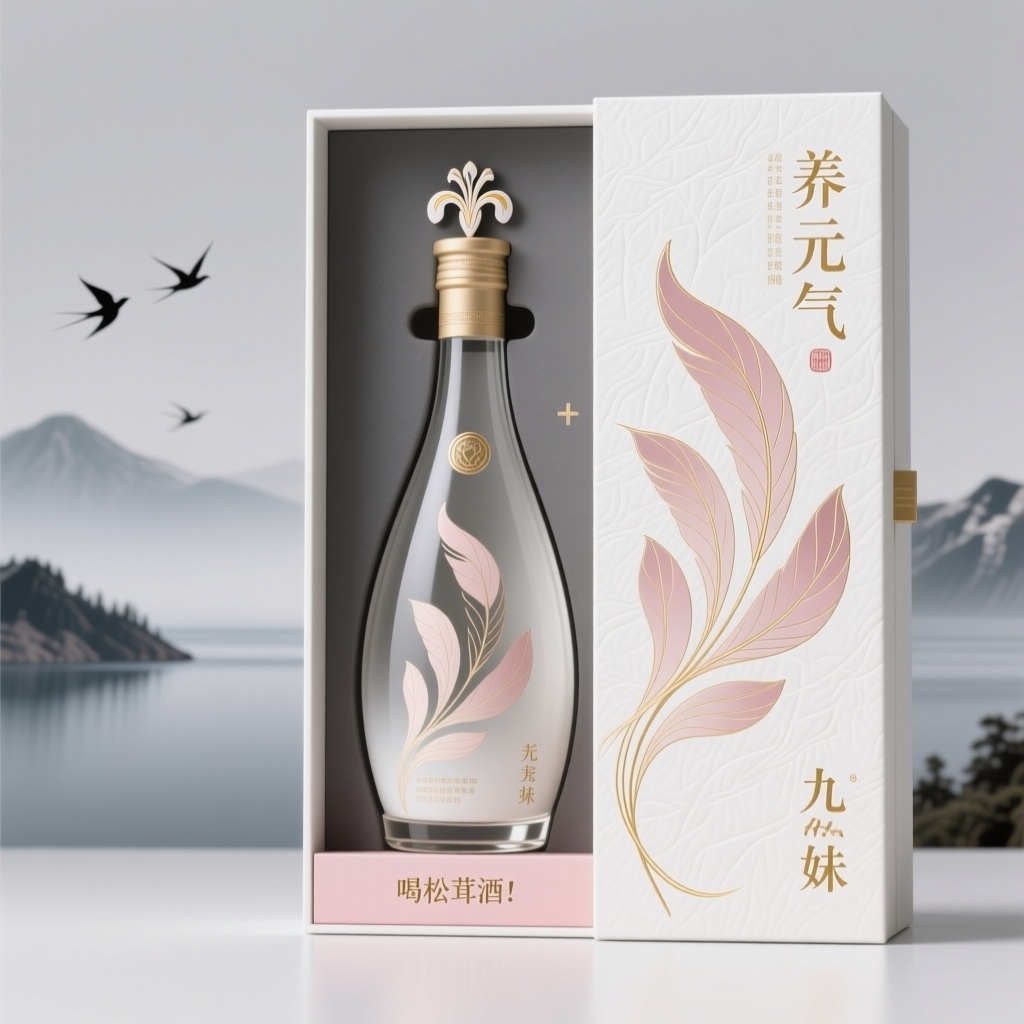- **设计元素**:背景层为渐变雾面磨砂质感;主图案为九道流线型飞羽/花瓣抽象纹样暗喻“九妹”;装饰线条采用金色细勾边呼应女性高贵;瓶盖顶部镶嵌小巧鸢尾花浮雕;包装盒面采用压纹宣纸质感,烫金工艺点缀飞鸟剪影