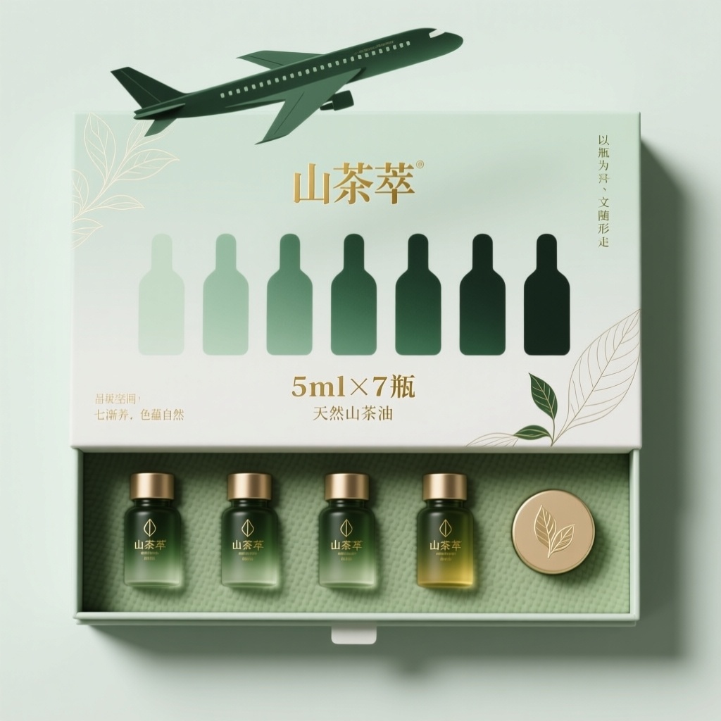 - **设计元素**:背景层为浅翠绿哑光肤感膜飞机盒+中央7阶渐变瓶影主图;装饰含顶部悬浮烫金品牌名、底部规格文案、侧边山茶叶连续暗纹、植绒内托4+3分格防滑结构、7支收腰磨砂玻璃瓶(色阶精准渐变)、2cm×3cm圆角哑光标签+烫金容量文字+叶形暗纹、哑光金属盖(同步渐变色)、开盖特写清透浅金油体自然光泽;所有元素围绕“渐变”主题构建视觉动线与质感闭环。