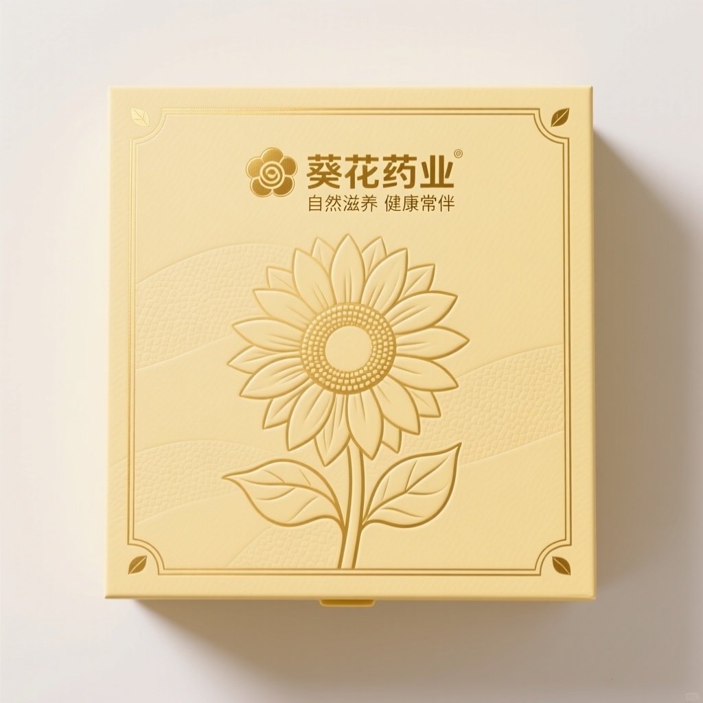 - **包装主视觉面排版**:上下排版(文字在上图案在下)——顶部居中放置品牌名“葵花药业”与宣传语,采用金色烫印字体;下方以浮雕工艺呈现简约线条勾勒的向日葵图案,奶黄色背景衬托,视觉重心稳重优雅,突出品牌与自然意象。