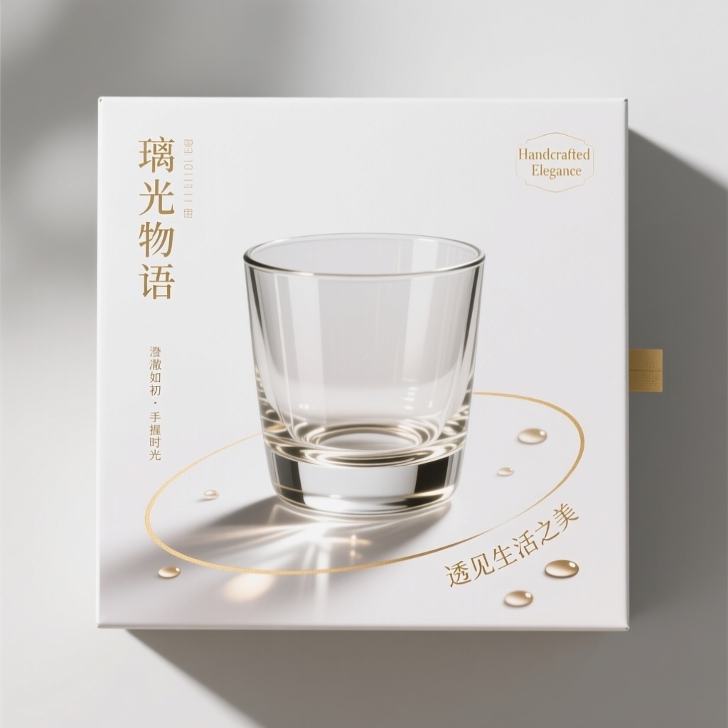- **包装主视觉面排版**:以商品为主式排版(中央大幅高清玻璃杯实拍图占据视觉核心,杯体晶莹剔透反射柔光;品牌名“璃光物语”横向排列于杯身左侧垂直空间,采用细长衬线字体;宣传语“透见生活之美”弧形环绕杯底曲线排布,右上角点缀烫金小标“Handcrafted Elegance”强化精致感)