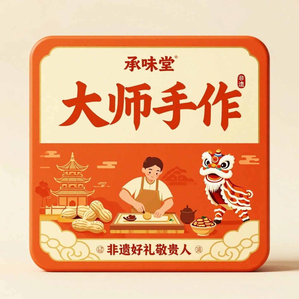- **包装主视觉面排版**:上下排版(文字在上图案在下)——顶部1/3区域横向居中排列品牌Logo与巨型桔红书法“大师手作”字样,“非遗”印章嵌于“大”“师”字间;底部2/3区域为扁平插画组合场景:中央为手艺人制作动作,左侧花生与宝塔、右侧舞狮与食器对称分布,祥云纹沿画面底边横向延展;信息文字“非遗好礼敬贵人”与净含量图标分两行置于插画区正下方,形成清晰的视觉阅读动线。
