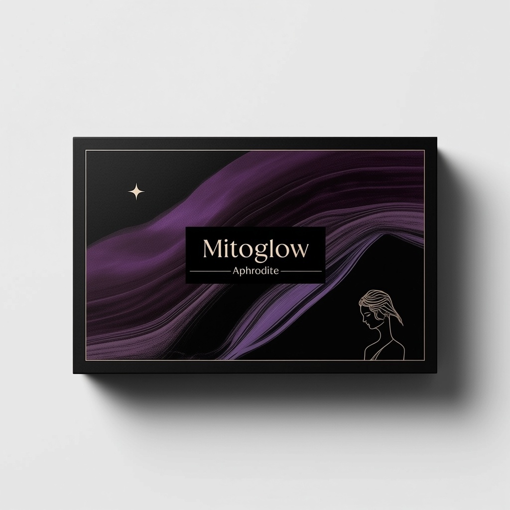 - **包装主视觉面排版**:覆盖式排版(深紫色渐变抽象纹理作为底层背景,品牌名“Mitoglow”以哑光黑色块衬底横向居中放置,产品名“Aphrodite”以纤细烫金字体叠加于品牌名下方,视觉重心集中于中央文字区,图案不喧宾夺主)