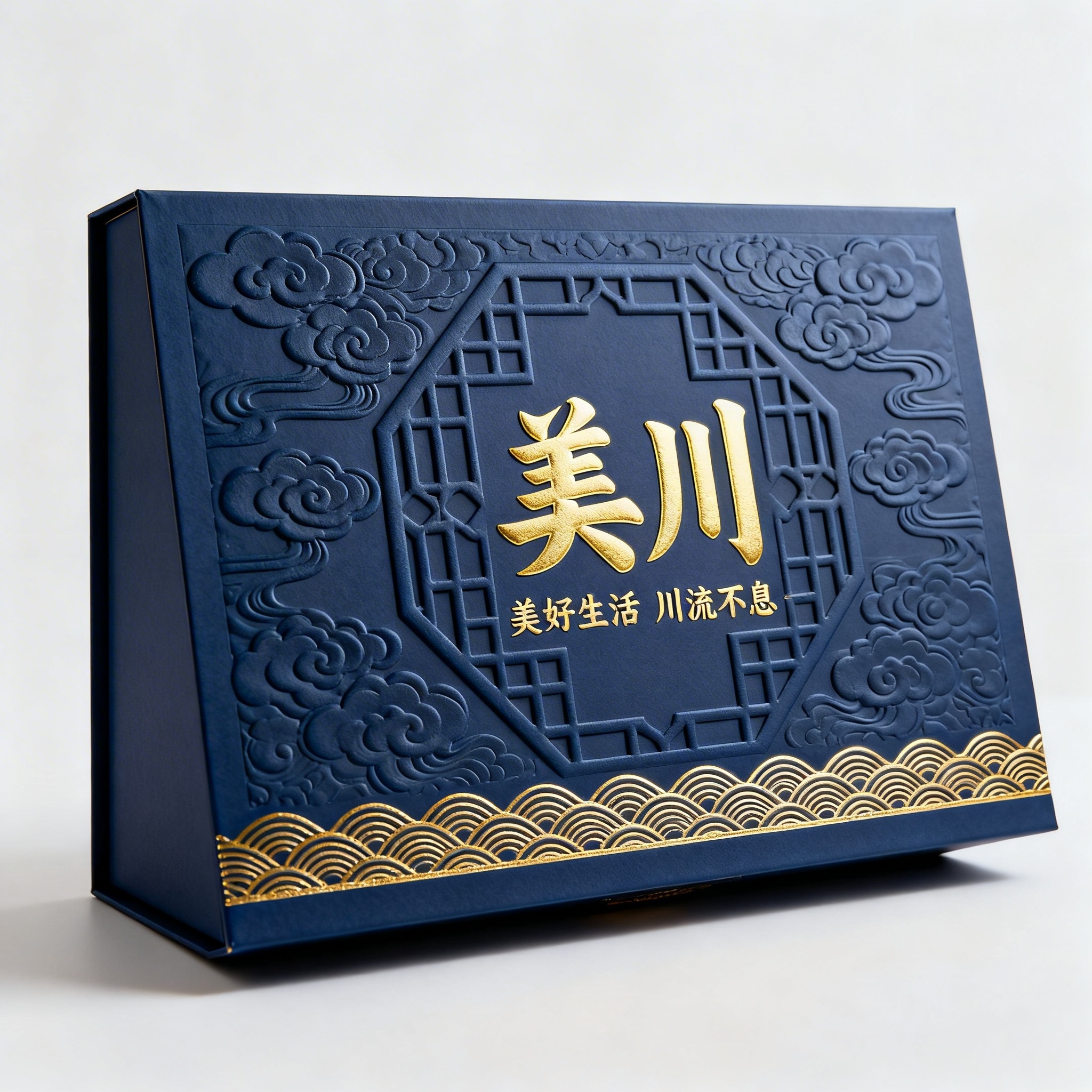 - **设计元素**:背景层为祥云与中式花窗格击凸浮雕纹理;主图案为“美川”烫金大字;装饰图案含底部海浪线条边框;无小图标;材质为350g哑光特种纸,触感细腻沉稳,通过击凸+烫金双工艺强化层次与光泽