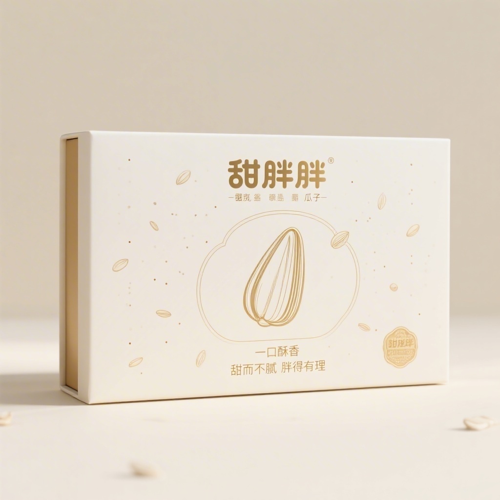 - **包装主视觉面排版**:以文字为主式排版,主标题“甜胖胖”居中放大处理,采用无衬线粗体字强化视觉焦点,副标宣传语分三行错落排列于主标题下方,背景以极简瓜子轮廓线稿纹理作底纹,营造呼吸感与精致度