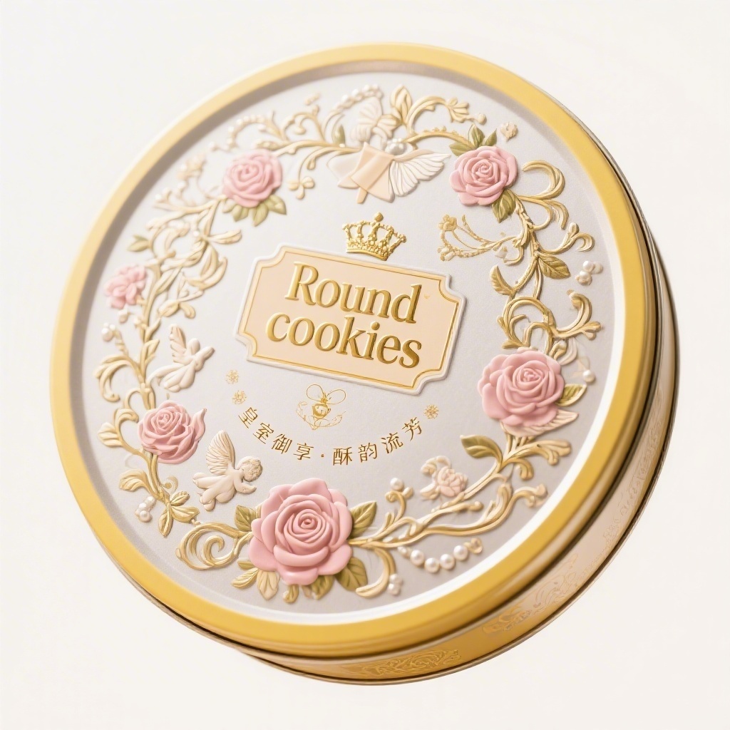 - **包装主视觉面排版**:覆盖式排版(繁复藤蔓花卉与天使浮雕图案作为底层视觉肌理,品牌名“Round cookies”置于中央偏上位置,以烫金立体字搭配米色描边色块托底,确保文字醒目;宣传语环绕品牌名下方呈弧形排列,字体纤细优雅,与背景图案形成层次对比)