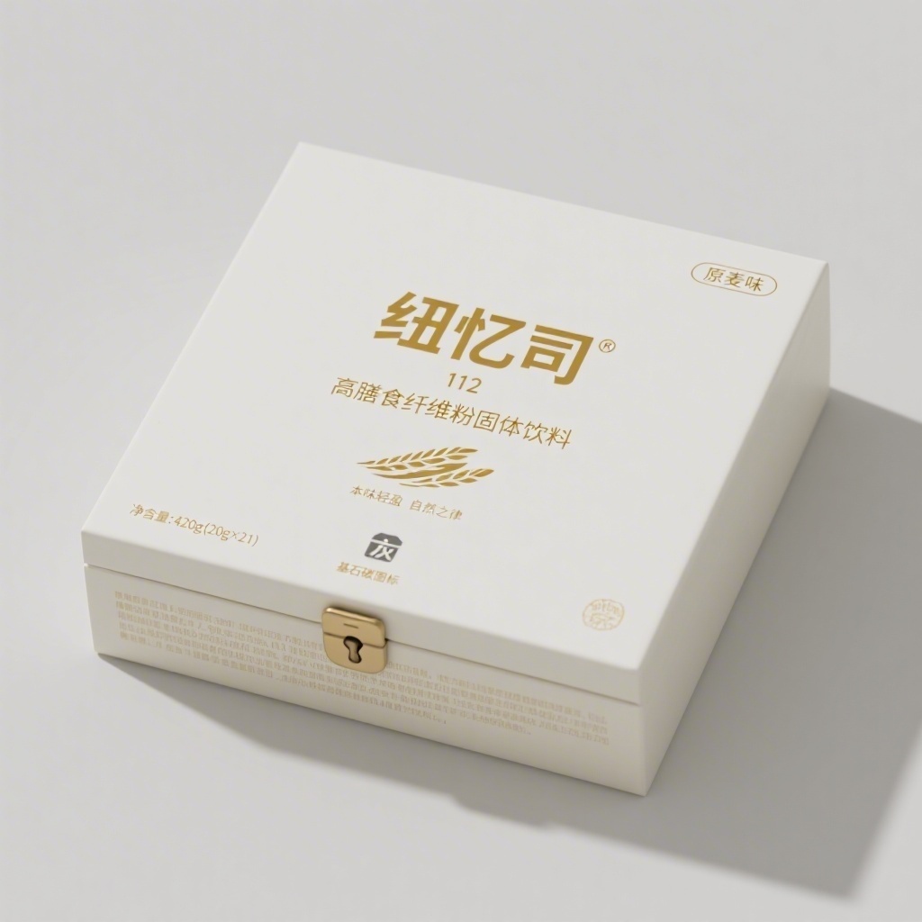 - **包装主视觉面排版**:上下排版(文字在上图案在下),顶部1/2区域为绝对文字主场——“纽忆司®”居中特粗无衬线大字烫哑光金,下方12mm处“高膳食纤维粉固体饮料”采用细高衬线体优雅下沉,形成黄金比例间距;右上角以0.8倍字号斜嵌“原麦味”标签,左下角对称标注净含量“420g (20g×21)”,构成隐形对角线平衡;底部1/2区域仅保留一枚微型“基石碳图标”居中悬浮于空白之上,如印章点睛;合规声明以等宽细体字横向满排于最底沿五分之一处,采用比主色浅两度的黄灰,行距1.8倍、字距固定,低调融入不割裂画面。