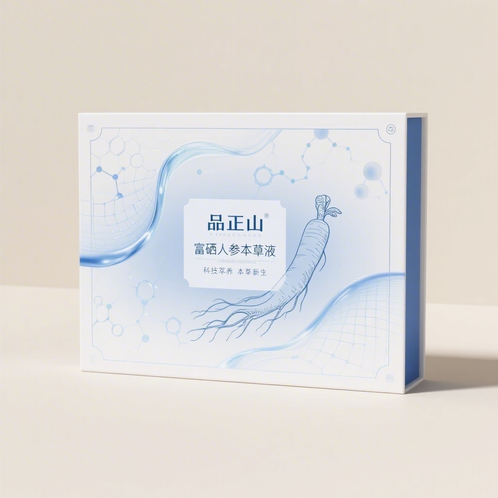 - **包装主视觉面排版**:覆盖式排版(背景层铺满抽象化细胞分子结构与液体流动轨迹,品牌主标题“品正山”置于视觉中心,使用半透明白色块衬底增强可读性,副标“富硒人参本草液”与宣传语分列其下,人参轮廓图案以线稿形式轻叠于文字后方形成层次)