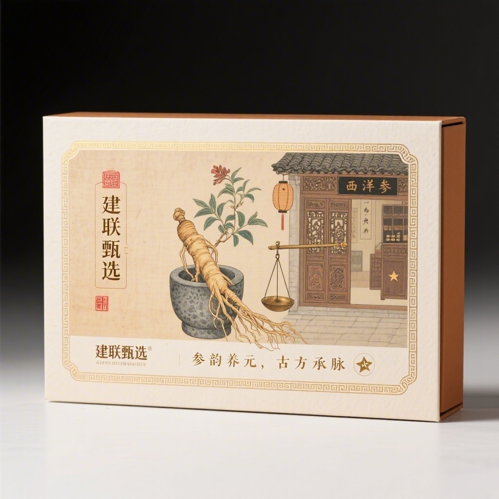 - **设计元素**:背景层为仿绢本设色肌理;主图案为写实西洋参根须缠绕青石药臼,背景透出雕花药柜与灯笼老街;装饰图案含药戥子、铜秤星点小图标与回字纹边框;装饰线条采用金箔描边与墨线云头纹;材质选用仿古宣纸复合特种纸,触感温润带纤维纹理