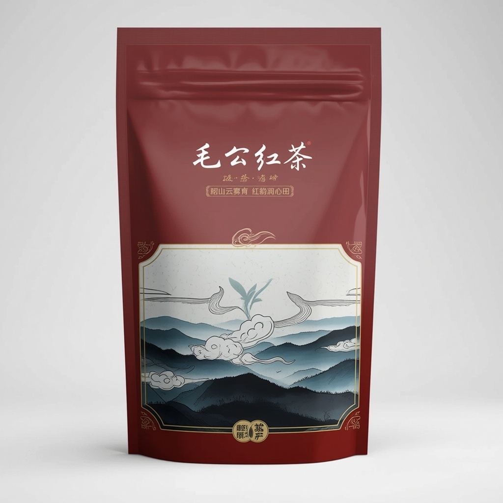 - **包装主视觉面排版**:上下排版(文字在上图案在下),上方居中排列品牌名“毛公红茶”与宣传语,采用书法字体强化文化感;下方为韶山全景水墨插画,山峦层叠、云雾缭绕,突出产地地理标识,图文比例约3:7,视觉重心下沉营造稳重感。