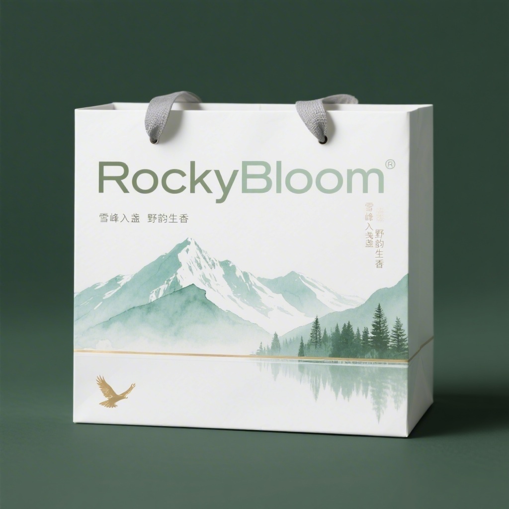 - **包装主视觉面排版**:满版排版(图文充满版面,营造视觉冲击),品牌名“RockyBloom”以现代无衬线粗体横向置于袋面中上1/3处,下方宣传语“雪峰入盏 野韵生香”以细体竖排于右侧;背景为极淡绿色渲染的落基山脉轮廓——雪顶、针林、镜湖层次分明却不抢眼,文字区域通过半透明白色蒙版轻柔提亮确保可读性,整体形成天地开阔、图文共生的沉浸式构图。