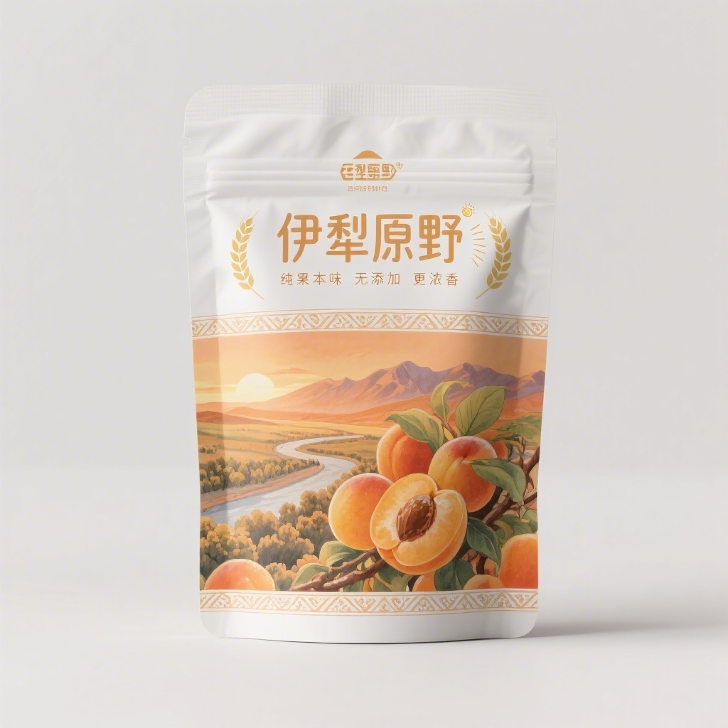 - **设计元素**:背景层为渐变暖橙色模拟日落河谷;主图案为写实水彩风格成熟杏果簇与远山轮廓;装饰图案含极简维吾尔族纹样边框线条;点缀金色麦穗与阳光射线小图标;材质选用哑光覆膜纸感提升天然触觉联想。