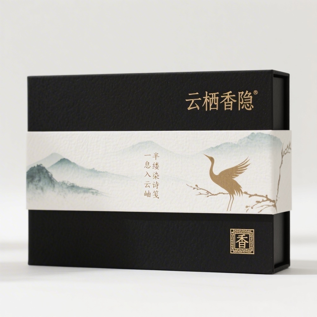 - **设计元素**:背景层为宣纸肌理叠加极淡青灰山水晕染;主图案为抽象化飞鹤衔枝剪影位于右下角;装饰线条为纤细金色回纹边框;小图标为篆刻印章式“香”字落款;材质选用特种艺术纸+局部绢布触感涂层
