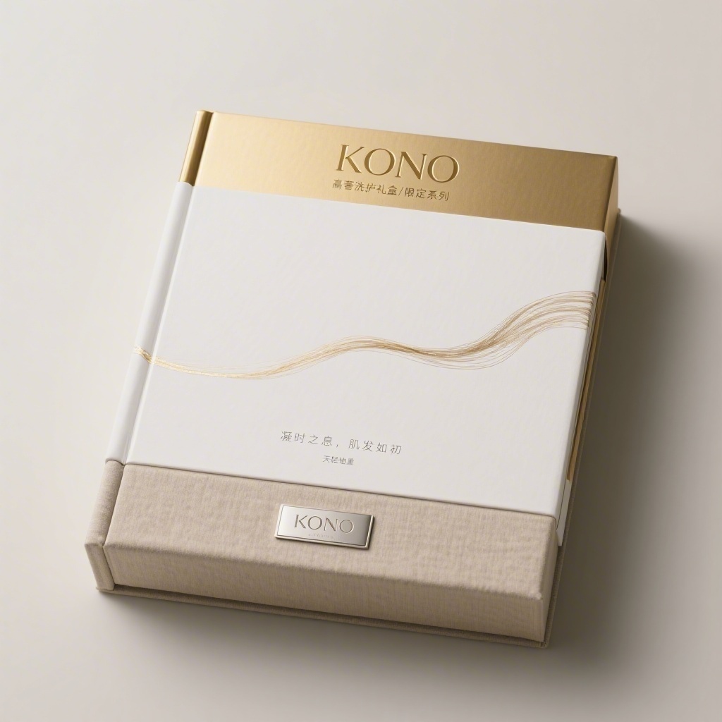 - **包装主视觉面排版**:上下排版(文字在上图案在下)——品牌名“KONO”以定制衬线体烫哑光金置于顶部1/3黄金区,下方留白基底中仅嵌入一条自左向右微倾的手工描金发丝轨迹线,末端隐没于盒沿;宣传语“凝时之息,肌发如初”以极小字号古董白无衬线体横向排列于盒底边缘,如同水印般若隐若现,形成“天轻地重”的呼吸韵律。