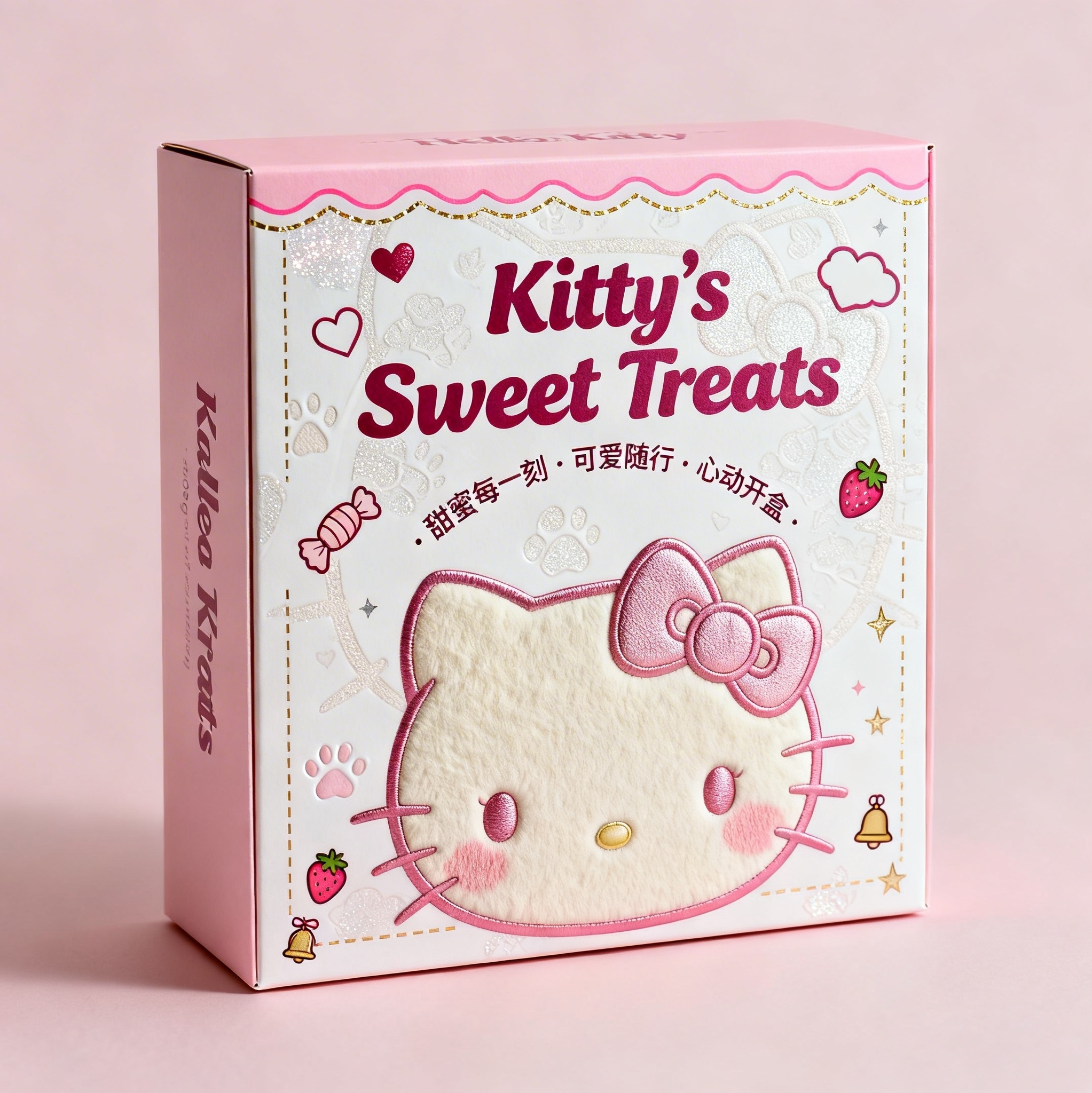 - **包装主视觉面排版**:以文字为主式排版(主标题“Kitty’s Sweet Treats”居于视觉中心偏上位置,采用圆润手写体放大加粗突出显示;Hello Kitty侧脸轮廓作为背景浅色水印纹理铺满版面,腮红与蝴蝶结局部做微浮雕UV工艺增强层次;宣传语分三组四字短语呈弧形排列于标题下方,形成视觉节奏)