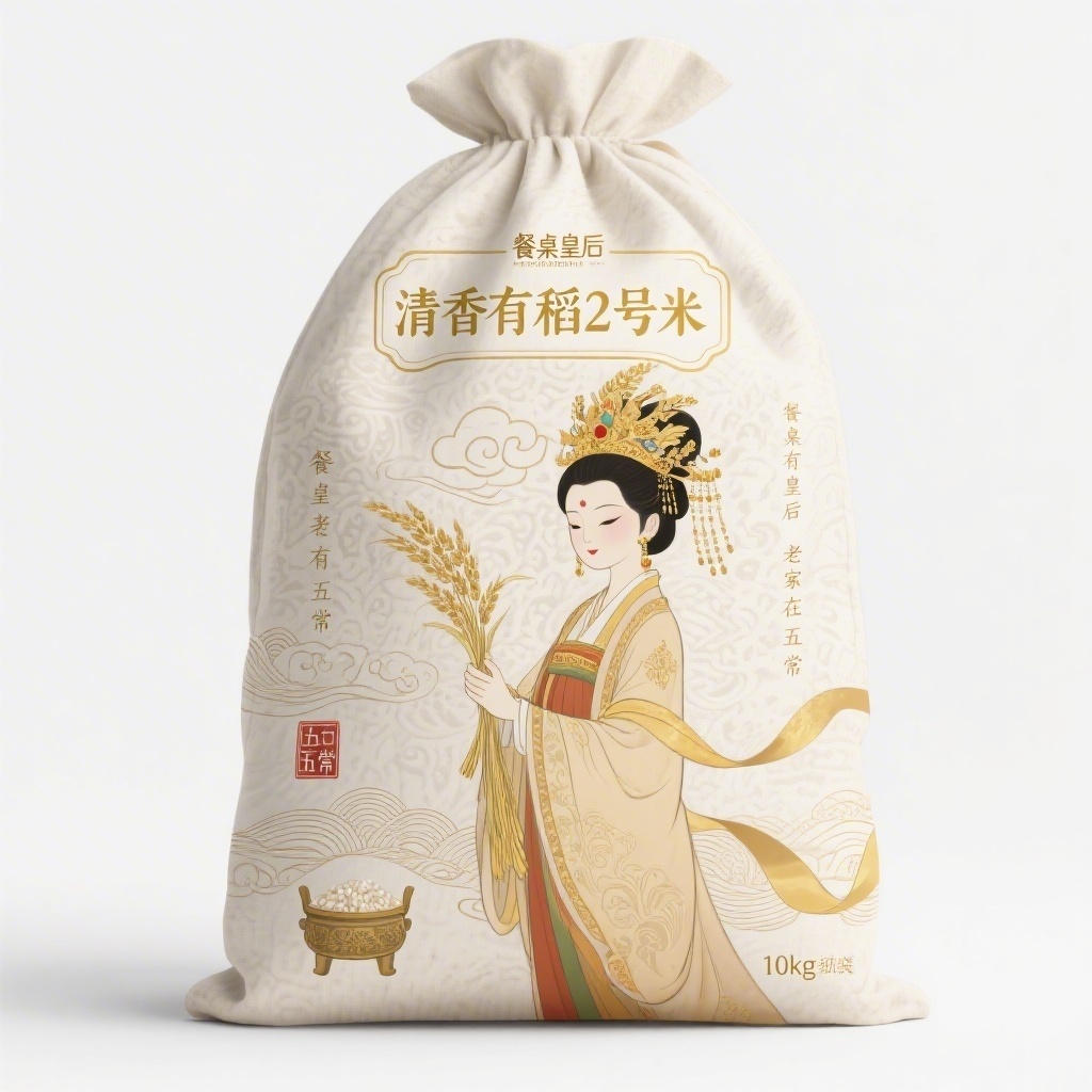 - **设计元素**:背景层为暗纹云锦纹理压印;主图案为手绘皇后侧身立像,凤冠霞帔缀金色流苏,手持稻穗;装饰图案含祥云纹、稻浪波纹与篆体“五常”印章;装饰线条采用描金边框与飘带形色块引导视线;小图标为微型御膳房鼎炉与稻粒组合图标;编织袋表面做仿宣纸肌理处理提升触感层次
