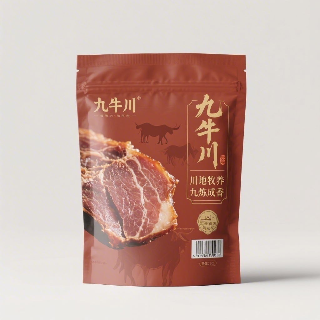 - **设计元素**:背景层为哑光肉色渐变基底;主图案为微距拍摄带筋膜纹理的风干肉切片;装饰图案含抽象化九牛剪影水印与川字篆刻印章;装饰线条为右侧文字区外框极细金线描边;小图标含牧场海拔标尺与非遗工艺徽章;材质选用高阻隔哑光复合膜+局部烫金+浮雕压纹