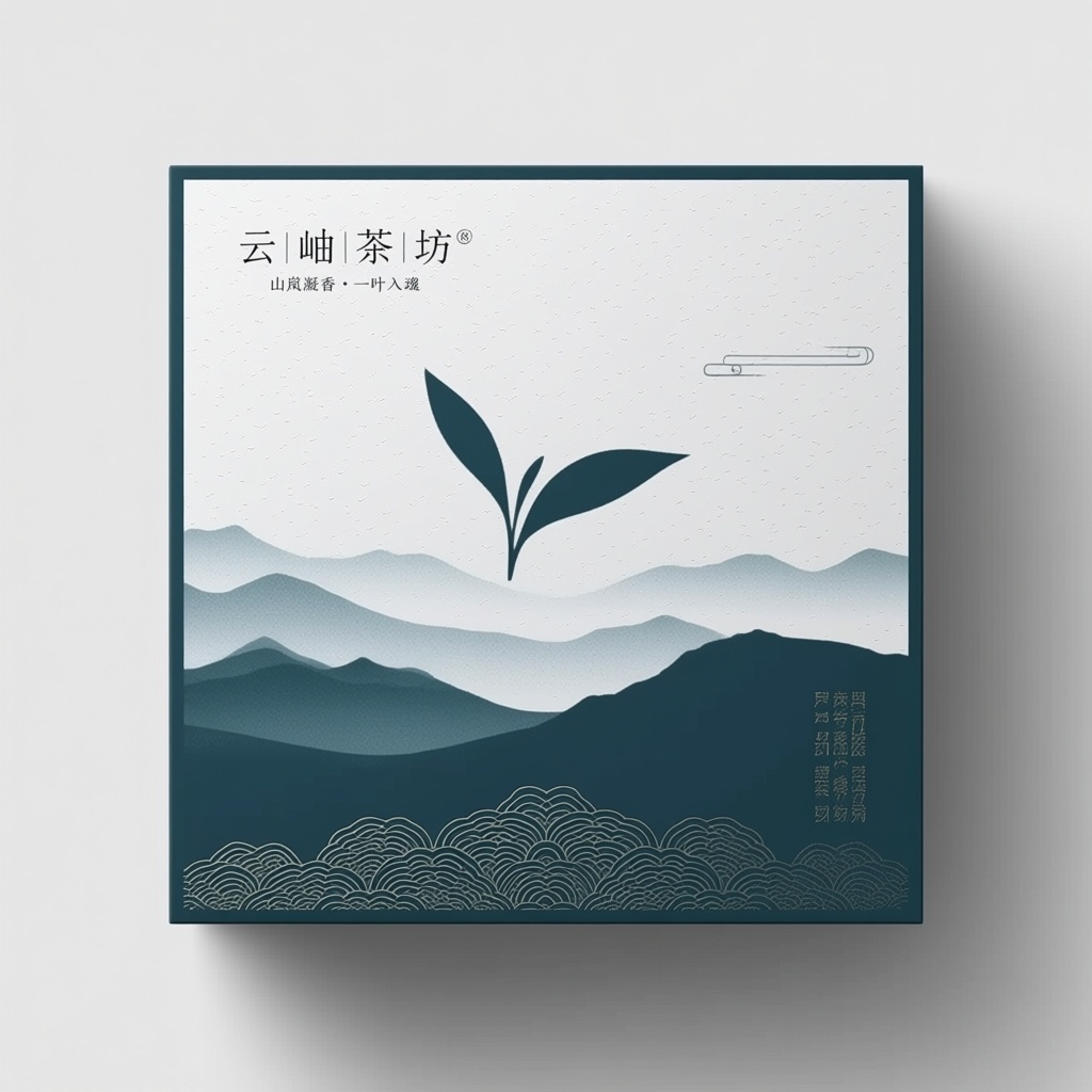 - **包装主视觉面排版**:上下排版(文字在上图案在下)——顶部居中排列品牌名“云岫茶坊”与四字宣传语分两行错落布局,下方大面积留白区域以水墨晕染山峦轮廓为底,中央悬浮一片写意茶叶剪影,形成视觉重心,底部边缘压印烫金云纹装饰带