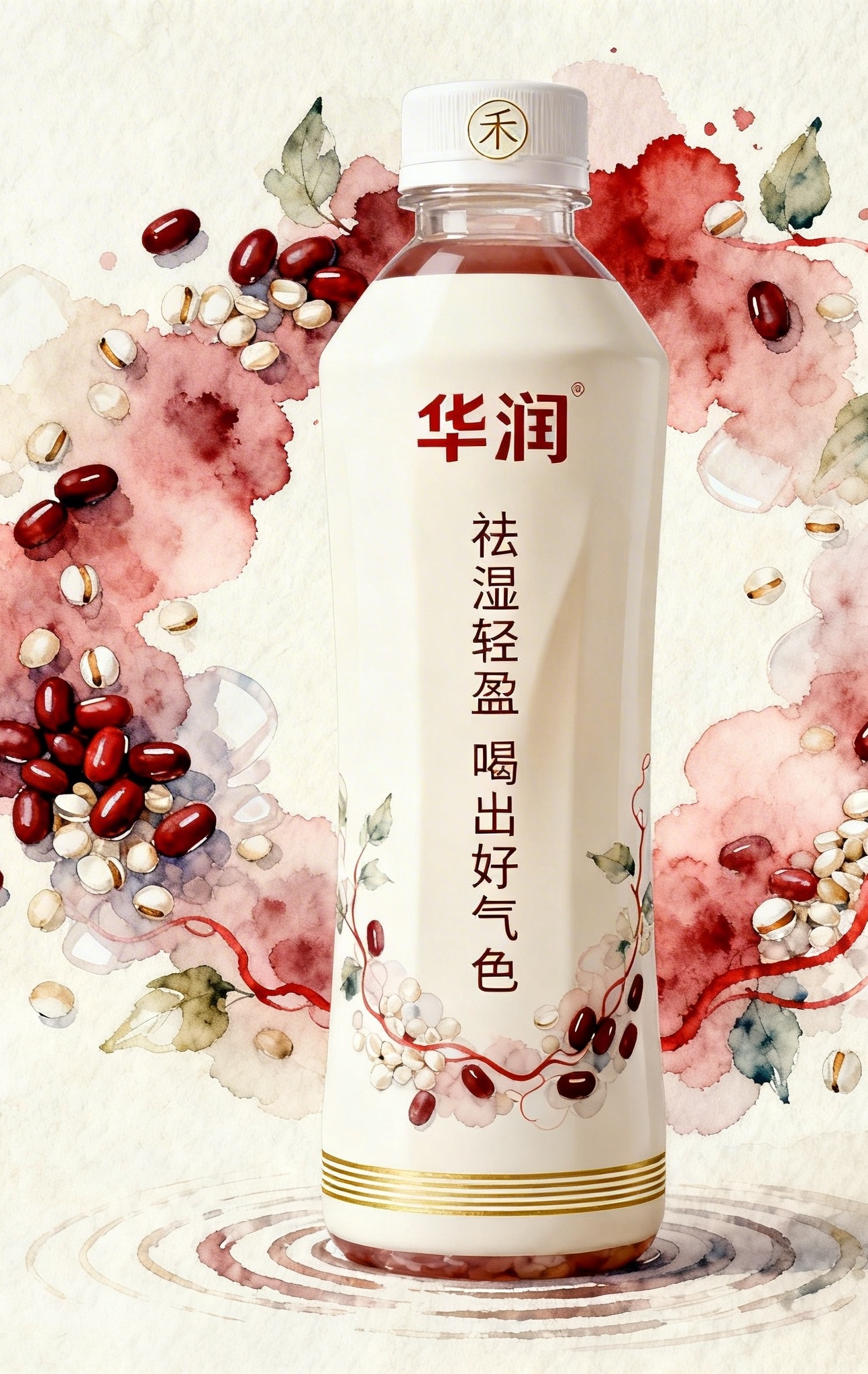 - **包装主视觉面排版**:环绕式排版(瓶身中央纵向排列品牌名“华润”与宣传语,文字采用米白色加轻微投影突出;四周以水彩晕染的红豆、薏米颗粒与藤叶图案呈自然流动状环绕文字,形成视觉向心力,图案由浓至淡向外扩散,营造轻盈呼吸感)