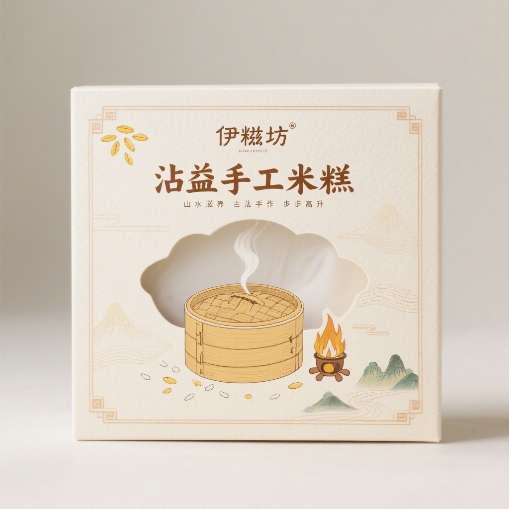 - **设计元素**:背景层为浅米色肌理纸基底模拟米浆质感,主图案为线描风格竹蒸笼与袅袅蒸汽组合,装饰图案含散点分布的大米粒与山泉水波纹线条,边框采用浅棕色仿木纹压印线条,四角嵌入微型柴火灶台小图标;包装材质选用环保棉感艺术纸,触感温润哑光