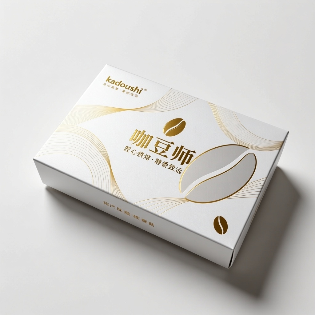 - **包装主视觉面排版**:以文字为主式排版。品牌名“咖豆师”采用加粗无衬线字体居于正面视觉中心偏上位置,通过局部烫金工艺突出显示;抽象咖啡豆图案作为低透明度的背景纹理铺满整个版面,几何线条装饰以极细的金色流线穿插于文字周围作为点缀,视觉侧重点完全集中在品牌标识上,营造高端静谧感。