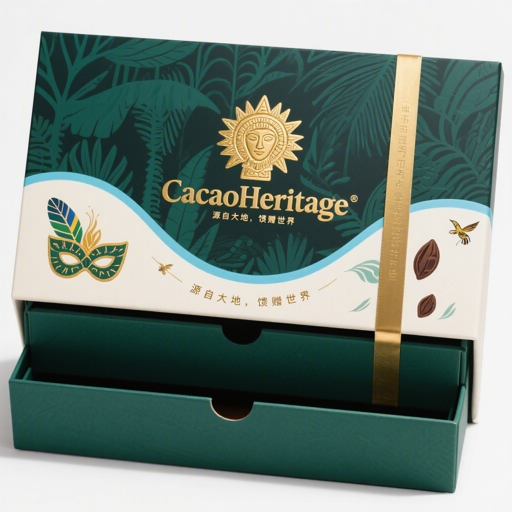 - **设计元素**:背景层为抽象化亚马逊雨林剪影纹理,主图案为金色玛雅太阳神浮雕图腾,装饰线条采用波浪形靛蓝边框,点缀小型蜂鸟与可可果小图标,表面选用哑光环保纸带局部UV亮面工艺