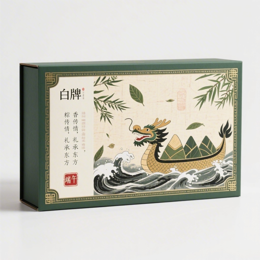 - **包装主视觉面排版**:左右排版(左侧竖排品牌名与宣传语,右侧为大幅手绘龙舟竞渡场景,文字区以浅底衬托强化阅读性,图案区满幅渲染营造动感节庆氛围)