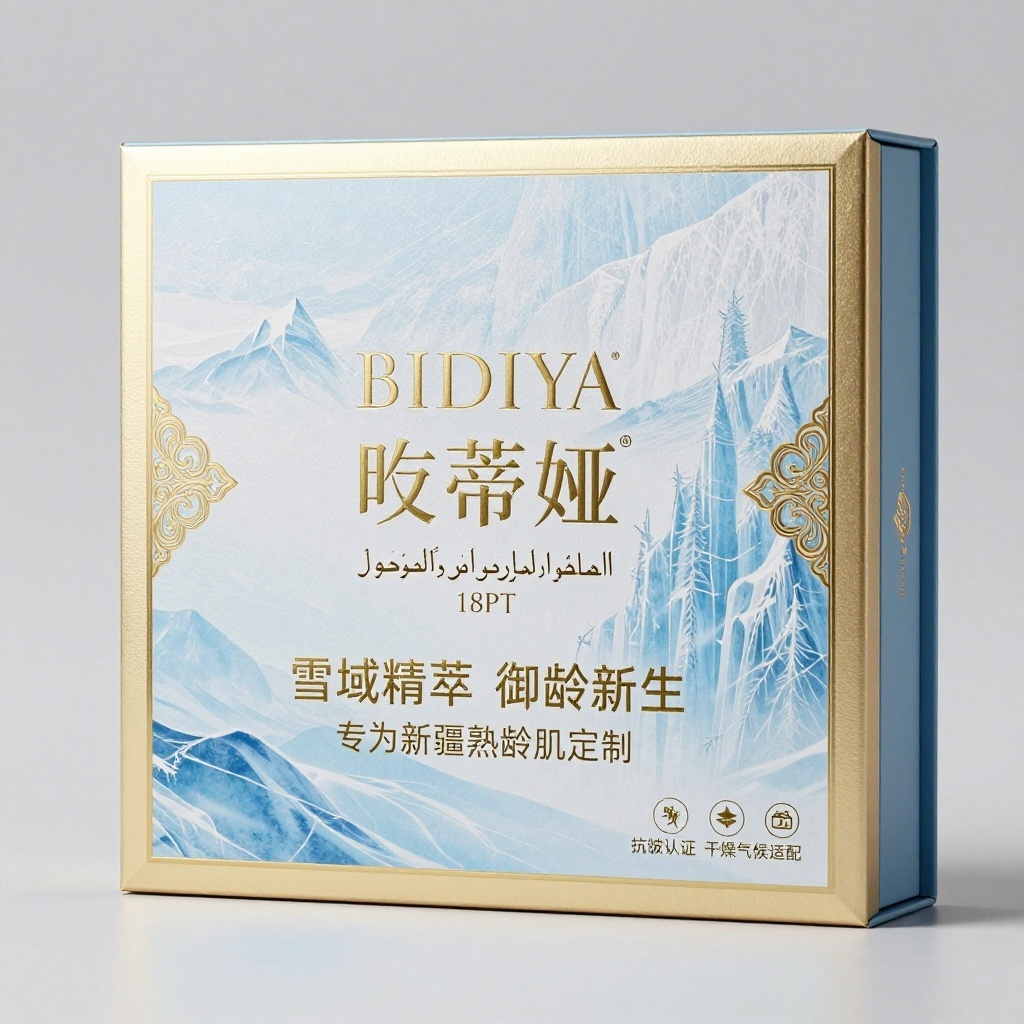 产品:陛蒂娅·天山雪莲奢养御龄套盒;品牌名:BIDIYA 陛蒂娅(维语名置于下方);包装样式:长方形精品礼盒,采用羊脂白肌理特种纸裱灰板,触感温润挺括;包装营销卖点:以“天山雪莲+冰川肌理”为核心元素,传递高原珍稀成分的奢养抗衰价值;包装主视觉面排版:上下排版,主标题“BIDIYA 陛蒂娅”烫哑金衬线体36pt,副标题维语名18pt居下,二级宣传语“雪域精萃 御龄新生”+“专为新疆熟龄肌定制”9pt分列两侧,三级净含量标注于右下角,图标文案含“抗皱认证”“干燥气候适配”;设计元素背景层为低透冰川UV暗纹,主图案为浮雕击凸天山雪莲工笔风绽放姿态,装饰图案含侧边卷草纹烫金线条,小图标为雪莲轮廓与海拔标高符号;设计风格:新中式轻奢融合新疆民族元素,极简肌理中透文化深度;主题配色:冰川蓝+哑光鎏金。