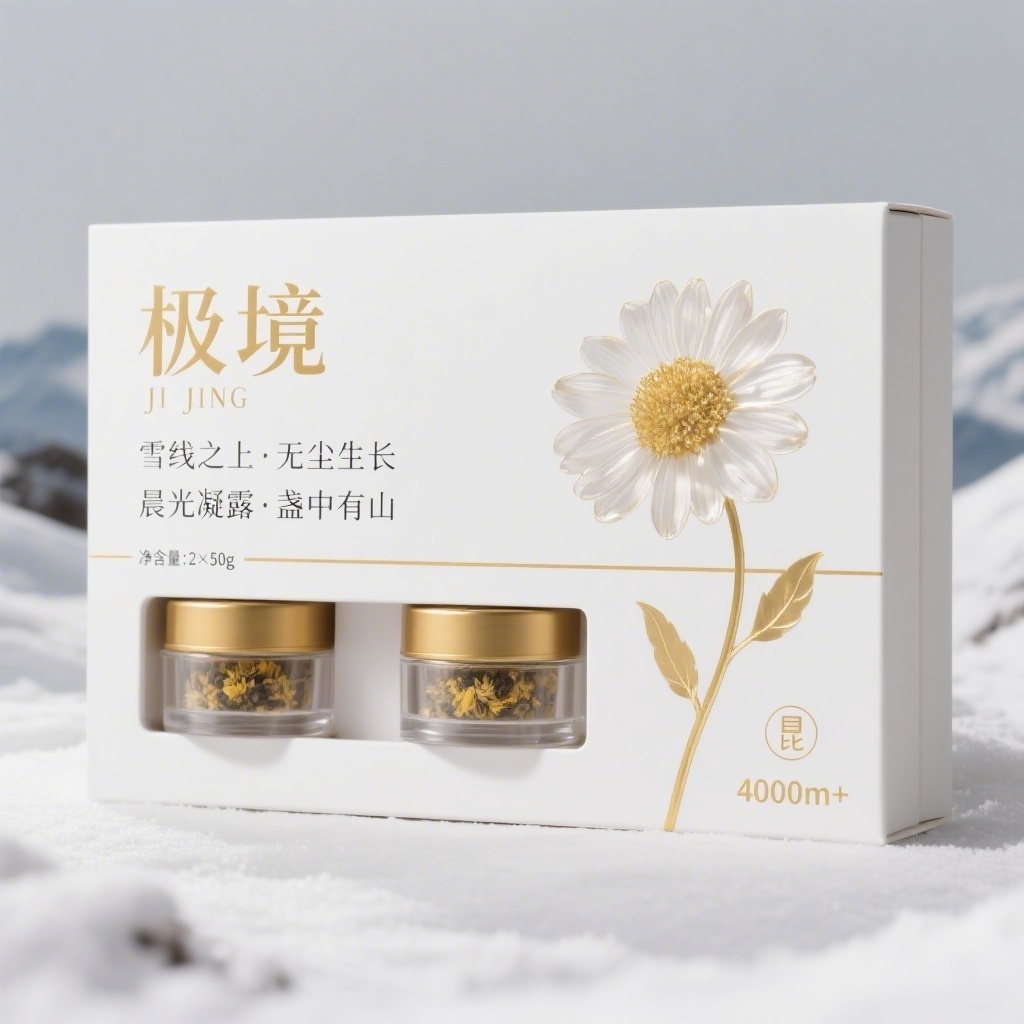 产品:昆仑雪菊茶(内含2罐PET金色盖装);品牌名:极境;包装样式:横式精品礼盒,磁吸闭合,300×100×70mm,2.5mm灰板覆哑光特种纸,触感如雪原般柔滑静谧;包装营销卖点:海拔4000米之上,只采一朵雪中金;包装主视觉面排版:满版极简排版,主标题“极境”居左上角无衬线粗体烫金字,副标题“JI JING”小字紧随其下;二级文字为两短句:“雪线之上·无尘生长”+“晨光凝露·盏中有山”,6pt极细黑体;三级文字“净含量:2×50g”与“4000m+”图标置于右下角;背景层纯白如雪,主图案仅一朵写实风雪菊居中偏右,花瓣透光描金,茎叶以0.5pt极细金线勾勒,无装饰纹样,仅在盒脊处压印一道横向金线模拟地平线;设计风格:当代极简主义融合自然留白美学;主题配色:主色昆仑白,辅色日光金。