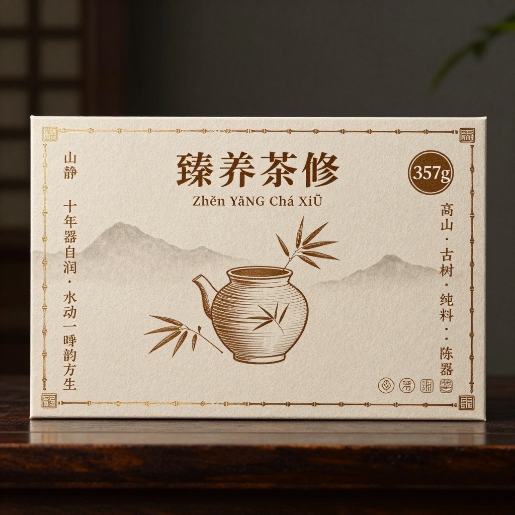 产品:普洱茶;品牌名:臻养茶修;包装样式:标准横向长方形礼盒(240×110mm),棉麻肌理纸+局部微击凸+哑光覆膜;主标题“臻养茶修”宋粗24pt居中稳构视觉锚点,副标题“Zhēn Yǎng Chá Xiū”楷体5pt轻托于下缘不压主线;宣传语“山静十年器自润|水动一瞬韵方生”左右对称各5.5pt精准字距;净含量“357g”嵌于右上角Φ9mm圆形章纹内4.5pt极细白字;背景为米色生宣透0.6%墨染山脉轮廓,主图采用单组线描古陶茶器+三片错落竹叶UV微光引导视线,上下边框0.4pt虚线竹节纹收束呼吸感,四角Φ7mm图标“高山·古树·纯料·陈器”小篆4.5pt激光精度排布;设计风格:极简国风掌尺度系列,图文层级清晰、放大无损,适配陈列与手持双场景,全系五款可无缝并列呈现生态叙事。