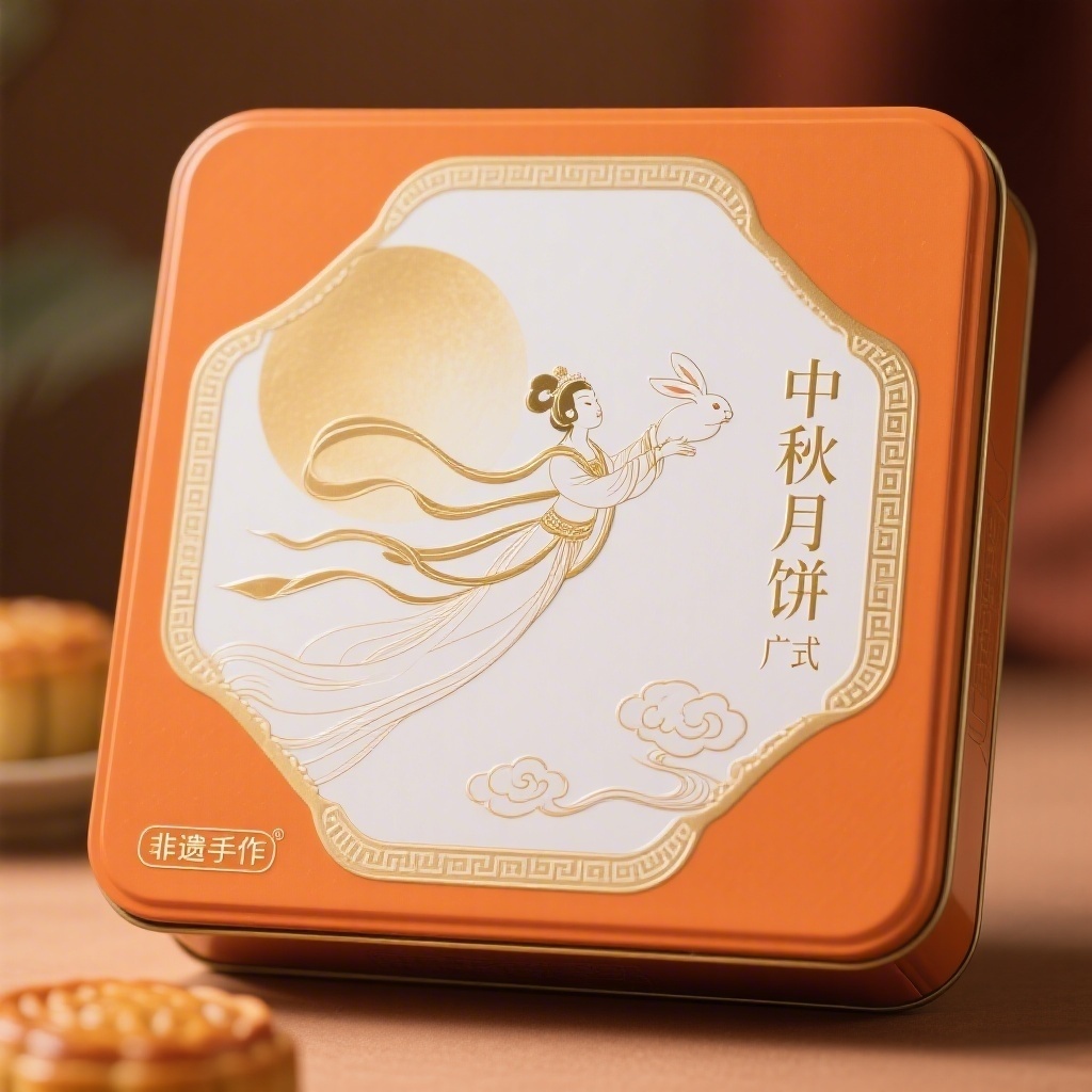 产品:广式中秋月饼;品牌名:御月瑧礼;包装样式:方形浮雕铁盒,爱玛仕橙哑光金属底衬局部立体烫金;包装营销卖点:以“嫦娥奔月”神话意境统领视觉,采用中心聚焦+呼吸留白排版,实现华丽而不繁复的东方轻奢美学;包装主视觉面排版:覆盖式排版,中央为极细金线工笔嫦娥携玉兔凌空飞升,衣带与三缕祥云构成动态三角构图,背景素金渐变圆月如薄雾晕染,无底纹压花,仅外缘设单线回纹金框,右侧竖排“中秋月饼”瘦金体烫金32pt,“广式”8pt小字垂直对齐其下,左下角嵌“非遗手作”极简线徽,全画面文字与图案占比不足50%,留白舒展、层级清晰;设计风格:新国风极简工笔融合现代留白哲学;主题配色:爱玛仕橙主色+哑光金辅色。