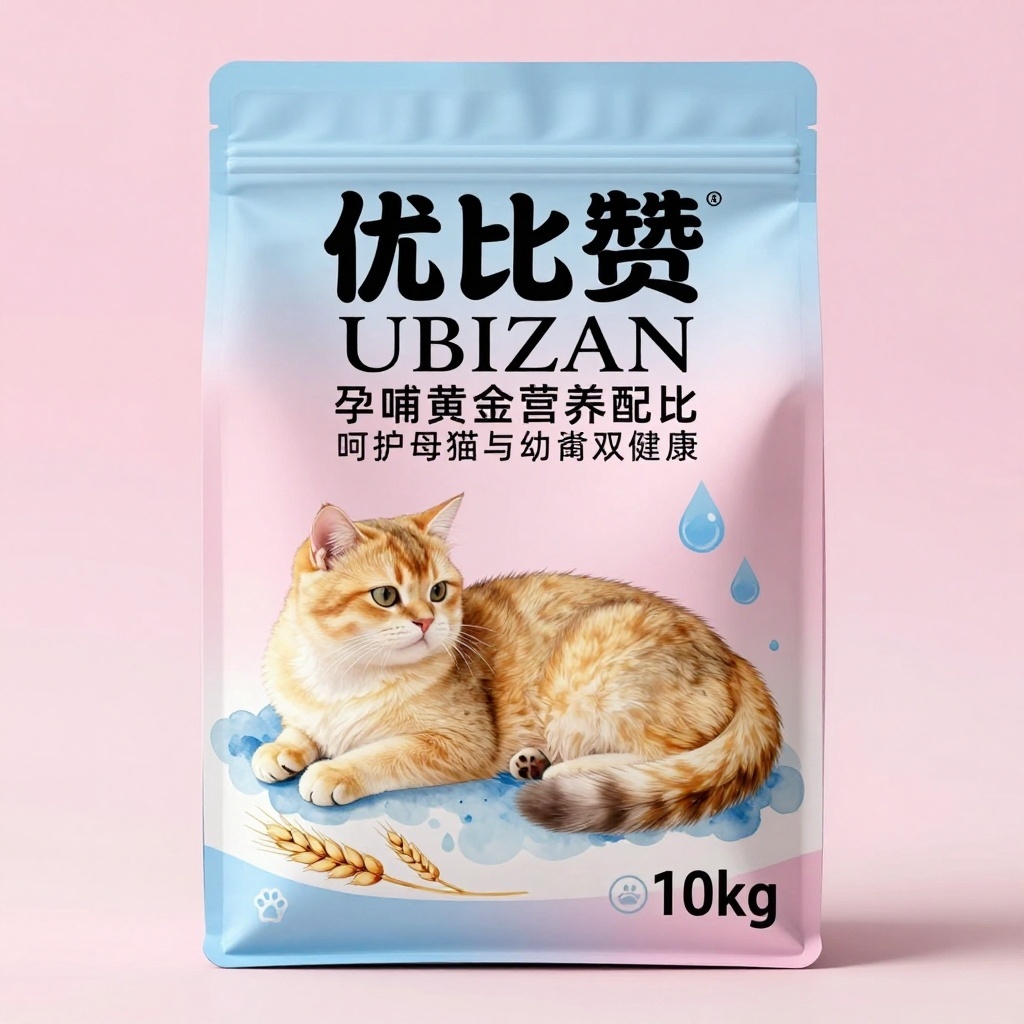 产品:繁育专用猫粮;品牌名:优比赞;包装样式:八边封拉绳袋,10kg,食品级哑光复合膜材质,触感柔韧防潮;包装营销卖点:以真实金渐层母猫形象为核心元素,传递“科学滋养·安心哺育”理念,强化孕哺期营养专业性;包装主视觉面排版:上下排版,主标题“优比赞”黑体加粗48pt居上,副标题“UBIZAN”衬线体24pt,二级文字“孕哺黄金营养配比”+“呵护母猫与幼崽双健康”无衬线体10pt分列两侧,净含量“10kg”置于右下角图标内;设计元素图案:背景层为柔和粉雾渐变,中央主图案为工笔风格金渐层母猫侧卧哺乳姿态,毛发细腻晕染,眼神温柔,下方点缀淡蓝水彩风奶滴与麦穗装饰纹,四角嵌入猫爪印小图标,整体留白呼吸感强;设计风格:简约大气中带温馨叙事感,符合高端宠物食品调性;主题配色:主色柔雾粉,辅色天际淡蓝。
