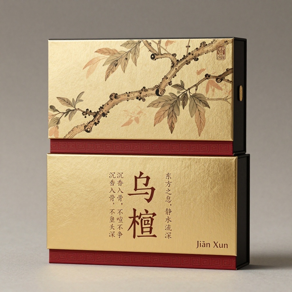 - **包装主视觉面排版**:上下排版(上半部为工笔风乌檀枝干水墨插画,枝条蜿蜒向上延伸至盒顶,下半部为竖排主标题“乌檀”,字体为定制瘦金变体,字号48pt深咖压凹;副标题“Jiān Xún”以9pt纤细衬线体居右下角;宣传语1“沉香入骨,不喧不争”+宣传语2“东方之息,静水流深”分列主标题两侧如对联排布)