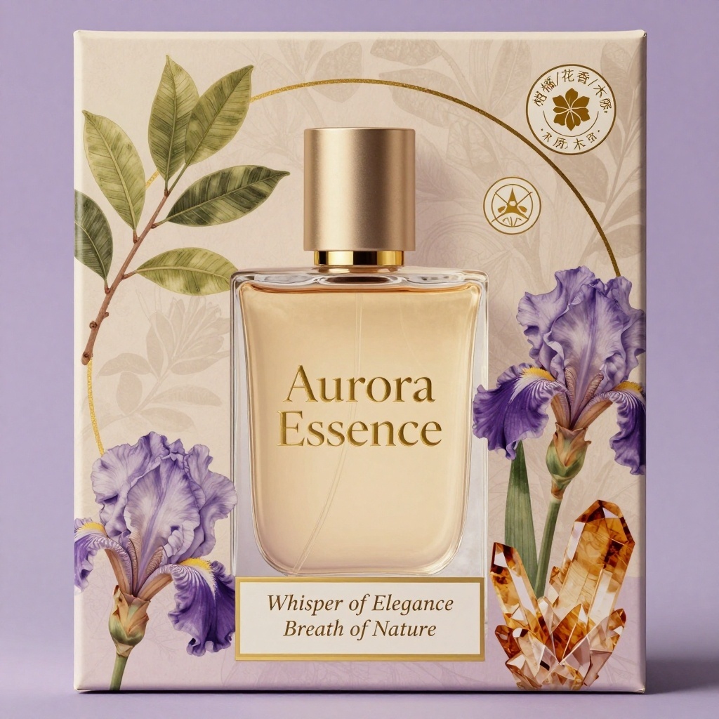 产品:外贸纯英文版香水;品牌名:Aurora Essence,宣传语“Whisper of Elegance, Breath of Nature”;包装样式:礼盒式纸盒+玻璃香水瓶,纸盒采用高克重哑光艺术纸,触感细腻温润;包装营销卖点:以香调植物为视觉核心,传递自然奢韵的嗅觉艺术;包装主视觉面排版:覆盖式排版,香水瓶轮廓剪影淡透于背景,品牌名“Aurora Essence”居中烫金立体字(Helvetica Bold 36pt),副标题无;宣传语1“Whisper of Elegance”与宣传语2“Breath of Nature”(Garamond Italic 8pt)置于底部细金线框内;右上角缀香型徽章图标(柑橘/花香/木质);设计元素:背景层为磨砂纸基叠加半透香草藤蔓水印,主图案为抽象佛手柑枝叶、鸢尾花瓣与琥珀晶体插画,风格为水彩天然风,装饰线条为纤细鎏金弧线,小图标含香型符号与瓶盖旋钮微标;设计风格:现代轻奢极简风融合自然高定美学;主题配色:主色雾霭金,辅色暮光紫。