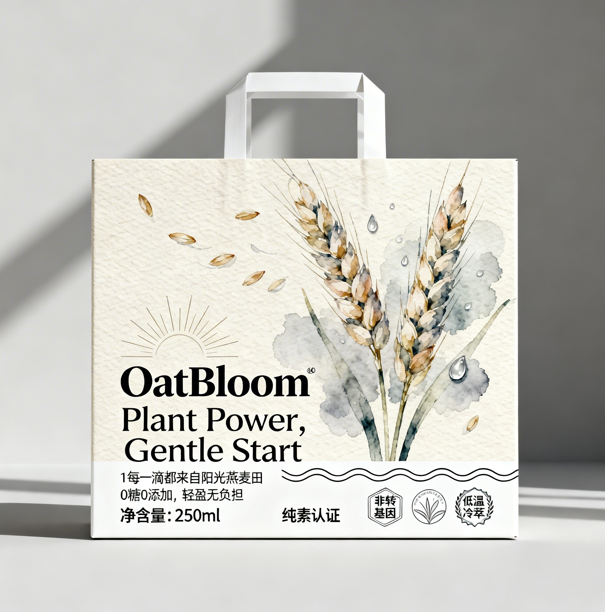 产品:燕麦乳饮料;品牌名:OatBloom;包装样式:长方形纸质手提袋,采用哑光环保牛皮纸材质,触感温润自然;包装营销卖点:以“每日清晨的第一口温柔”为核心,突出植物基、零添加、轻负担的健康理念;包装主视觉面排版:上下排版,主标题“OatBloom”字体为粗衬线体36pt,副标题“Plant Power, Gentle Start”为无衬线体8pt置于其下;二级文字宣传语1“每一滴都来自阳光燕麦田”+宣传语2“0糖0添加,轻盈无负担”,字号均为7pt;三级文字含“净含量:250ml”及“纯素认证”小图标文案;背景层为浅米色肌理纸纹,主图案为水彩天然风绘制的燕麦穗与露珠,柔和晕染;装饰图案含飘散谷粒与晨光射线,底部有手绘波浪线条分隔信息区;小图标含“非转基因”“低温冷萃”徽章式设计;设计风格:自然疗愈系极简美学;主题配色:主色燕麦原白,辅色晨雾浅灰。