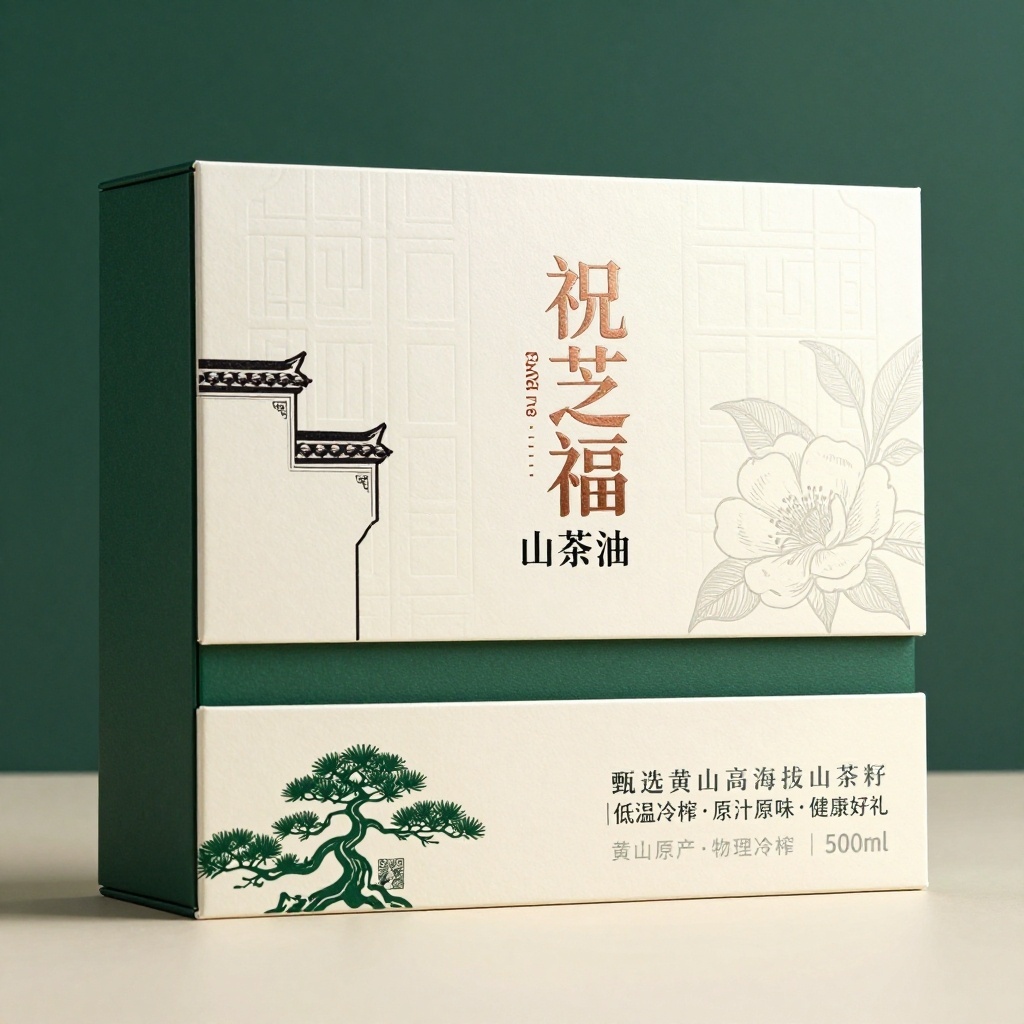 产品:山茶油商务礼盒;品牌名:祝芝福;包装样式:磁吸翻盖礼盒,280g哑光特种触感纸,触感细腻;包装营销卖点:以徽派建筑与黄山松为视觉符号,传递“原产地高端冷榨”的地域价值;包装主视觉面排版:上下排版,一级文字“祝芝福”居中烫古铜金击凸,副标题“山茶油”细黑体居其下,二级文字“甄选黄山高海拔山茶籽|低温冷榨·原汁原味·健康好礼”浅灰等线体置于右下角,三级文字含“黄山原产·物理冷榨”及500ml标识;设计元素背景层为象牙白底压印极简窗棂暗纹,左侧边角抽象马头墙线条、右侧山茶花轮廓均采用工笔风勾勒,盒底微型黄山松剪影点缀,无装饰线条,仅配溯源二维码小图标;设计风格:极简徽派美学,克制稳重;主题配色:哑光深绿+象牙白。