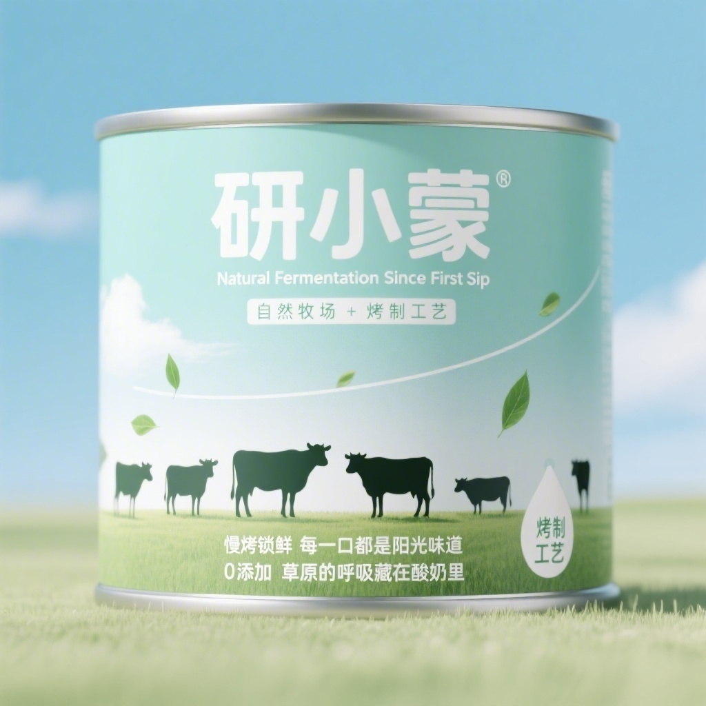 产品:草原烤酸奶;品牌名:研小蒙 · 自然发酵 醇香如初;包装样式:马口铁罐装,哑光白纸贴面配局部压纹绿叶触感;包装营销卖点:以“自然牧场+烤制工艺”为核心,强调原生态奶源与独特烘烤风味;包装主视觉面排版:上下排版,上1/3区域横向居中无衬线粗体“研小蒙”48pt,副标题“Natural Fermentation Since First Sip”10pt;下2/3为剪影风奶牛群与写意绿叶漂浮于渐变蓝天白云背景,纤细白色弧线模拟地平线分隔图文,右下角乳滴图标内嵌“烤制工艺”手写体8pt;二级宣传语1:“慢烤锁鲜 每一口都是阳光味道”、宣传语2:“0添加 草原的呼吸藏在酸奶里”各9pt;设计风格:极简主义融合自然意象;主题配色:主色薄荷绿,辅色纯白。