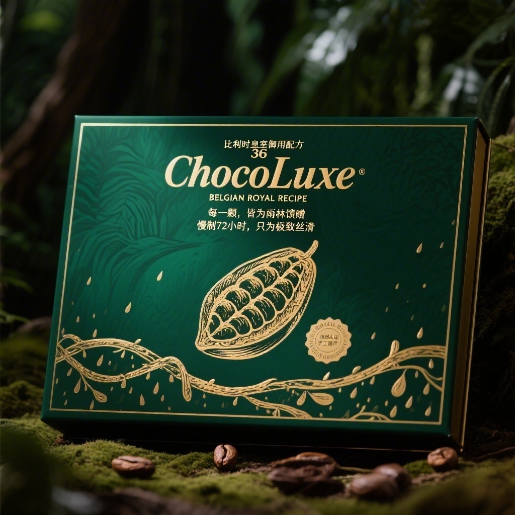产品:高端手工巧克力;品牌名:ChocoLuxe;包装样式:长方形精品礼盒,采用哑光艺术纸材质,触感细腻柔滑;包装营销卖点:以“比利时皇室御用配方”为核心,突出原料可可豆源自非洲雨林原产地,强调稀有与匠心工艺;包装主视觉面排版:上下排版,主标题“ChocoLuxe”使用衬线体36pt居上,副标题“BELGIAN ROYAL RECIPE”无衬线体18pt,宣传语1“每一颗,皆为雨林馈赠”+宣传语2“慢制72小时,只为极致丝滑”均为9pt手写体;背景层为深绿渐变丛林纹理,主图案为金色线稿风可可果剖面插画居中偏下,装饰图案含藤蔓缠绕边框与烫金雨滴散点,小图标含“雨林认证”“手工制作”徽章式圆形标;设计风格:轻奢复古插画风,融合欧式纹样与自然元素;主题配色:墨绿主色搭配香槟金辅色。