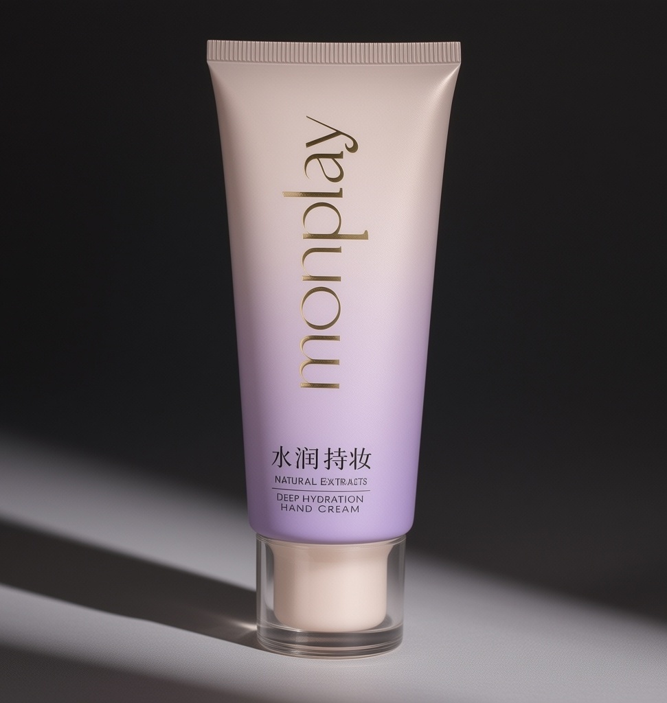 产品:粉底液;品牌名:monplay;包装样式:粉底玻璃瓶,瓶身采用高透光磨砂玻璃材质,触感柔润细腻;包装营销卖点:以“奢润滋养·水润持妆”为核心,强调成分天然与妆效持久双重价值,锁定25-35岁追求精致妆容的轻熟女性;包装主视觉面排版:采用上下排版,顶部为竖排“monplay”定制衬线体烫金凹印,字号24pt,中部横排“水润持妆”黑体18pt搭配英文“Natural Extracts”8pt细衬线体,底部“Deep Hydration Hand Cream”6pt极细字体,整体留白遵循黄金比例;设计风格:轻奢极简风,融合现代垂直信息流与呼吸感布局;主题配色:雾粉底+香槟金文字 / 浅紫渐变底+铂金色文字。