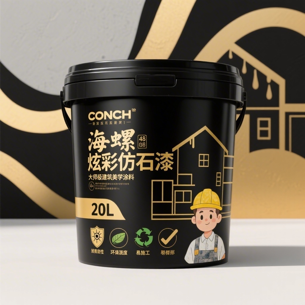 产品:海螺炫彩仿石漆;品牌名:CONCH;包装样式:20L黑色哑光塑料桶,桶身通体采用高密度哑光黑塑材质,触感细腻抗刮;包装营销卖点:以“大师级建筑美学涂料”为核心,融合金色别墅线条与几何色块,传递高端施工品质与艺术涂装体验;包装主视觉面排版:满版排版,左上角“CONCH”现代无衬线粗体烫金字(36pt),中上部“海螺炫彩仿石漆”创意书法融合工业字体烫金(48pt),右下角头戴黄帽包工头IP插画(水彩天然风+轻微卡通化),中下部四枚金色功能图标——耐候性(太阳+盾牌)、仿真度(石材纹理+眼睛)、环保(绿叶+循环箭头)、易施工(滚筒+对勾),背景层为流动曲线金色几何扁平块面,装饰图案含抽象别墅剪影与涂料滴落轨迹,无装饰线条;设计风格:极简主义融合轻奢建筑美学;主题配色:主色哑光黑,辅色香槟金。