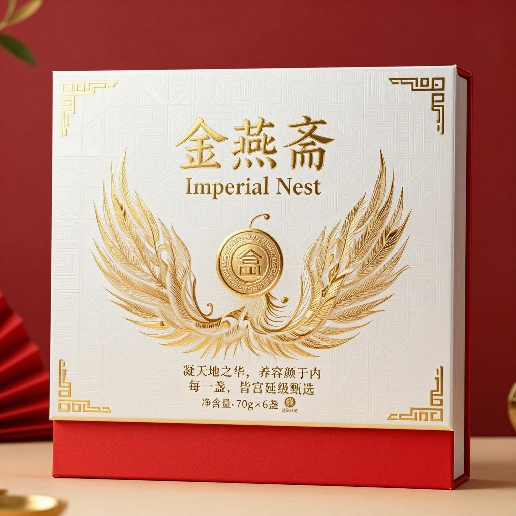 产品:燕窝;品牌名:金燕斋;包装样式:精品礼盒,外层选用厚实哑光艺术纸搭配局部亮面涂层,触感温润高级;包装营销卖点:以“皇家御膳·丝缕臻品”为核心概念,突出燕窝如金丝般珍贵纯净的天然属性;包装主视觉面排版:采用上下排版,主标题“金燕斋”烫金立体字居上,副标题“Imperial Nest”衬于其下,字体为衬线体28pt与10pt;二级文字宣传语1“凝天地之华,养容颜于内”+宣传语2“每一盏,皆宫廷级甄选”,字号6pt;三级文字含净含量“70g×6盏”及“溯源认证”小图标。背景层为珍珠白底压印暗纹几何藤蔓,主图案为飘逸燕窝丝状工笔风金色线条构成凤凰轮廓,中央悬浮品牌徽标浮雕,四角点缀对称回纹金边装饰,底部横向红色丝带贯穿强化视觉重心;设计风格:奢华典雅融合东方宫廷美学;主题配色:主色鎏金耀目,辅色朱红尊贵与珍珠白雅致。