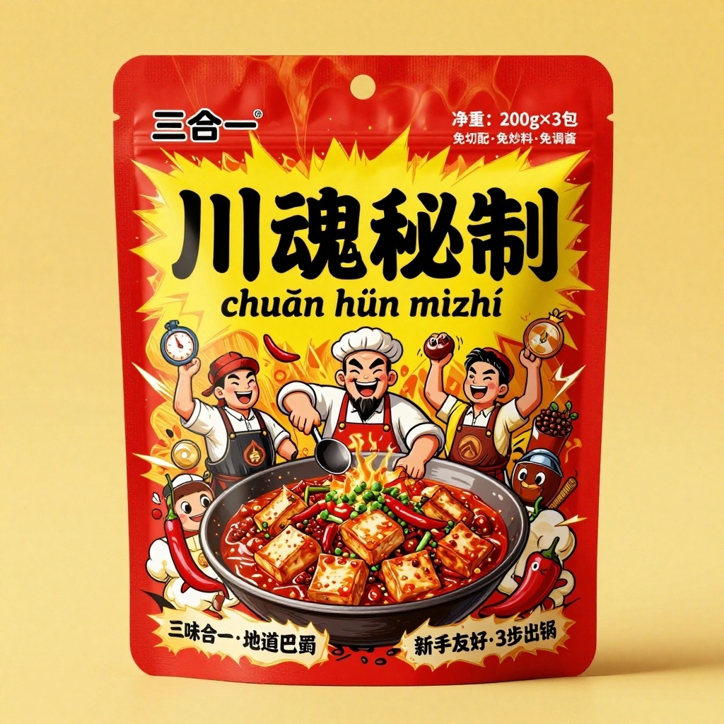 产品:三合一川菜调味料(麻婆豆腐/鱼香肉丝/回锅肉);品牌名:川魂秘制;包装样式:食品自立袋,采用哑光覆膜铜版纸材质,触感细腻防油污;包装营销卖点:一袋解锁三道经典川味,厨房小白秒变川菜大厨;包装主视觉面排版:满版排版,主标题“川魂秘制”黑体粗字72pt居中压阵,副标题“chuān hún mì zhì”36pt衬线体置于其下,宣传语1“三味合一·地道巴蜀”+宣传语2“新手友好·3步出锅”各12pt手写体分列左右下角,净含量“净重:200g×3包”8pt无衬线体标于右上,图标内文案“免切配·免炒料·免调酱”。设计元素:背景层为泼墨红油流淌肌理,主图案是夸张卡通风三位川菜师傅挥勺爆炒的动态插画,分别代表三道菜式,装饰图案为辣椒、花椒、豆瓣酱拟人化小精灵环绕四周,装饰线条用金色闪电形勾边强化动感,小图标含火焰、秒表、奖章等符号。设计风格:国潮插画混搭街头涂鸦风;主题配色:主色火辣朱红+辅色鎏金亮黄。