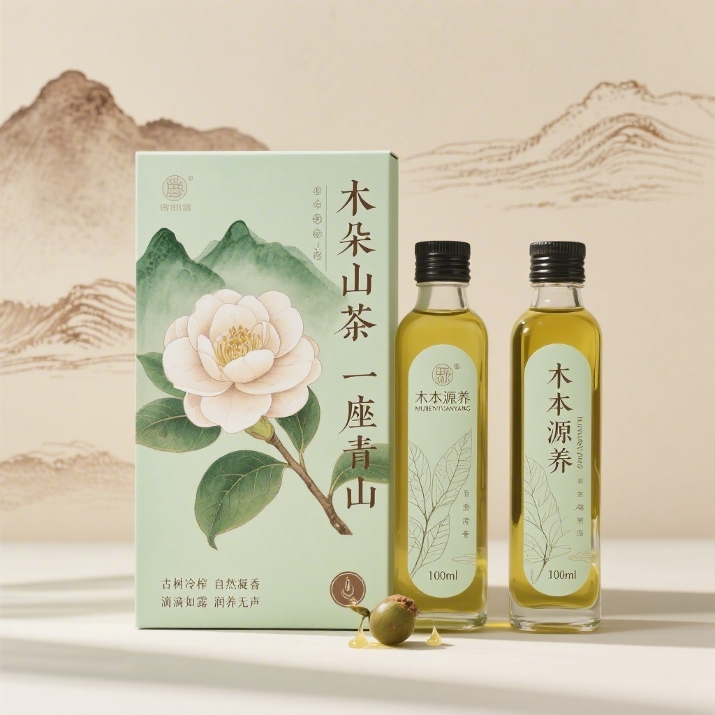 产品:山茶油;品牌名:木本源养;包装样式:100ml与500ml玻璃瓶瓶标,选用哑光棉感纸材质,触感柔和环保;包装营销卖点:以“一朵山茶 一座青山”为核心视觉符号,强调每一滴油源自原生态山林的自然凝萃;包装主视觉面排版:左右排版,左侧为工笔风山茶花主图案,花瓣层叠透绿晕染,右侧竖排主标题“木本源养”楷体36pt,副标题“MUBENYUANYANG”细宋体8pt,二级宣传语1“古树冷榨 自然凝香”、宣传语2“滴滴如露 润养无声”黑体7pt垂直排列于标题下方;背景层为米色水彩肌理衬底,山脉轮廓以极细棕色线稿浮于花影后方,瓶标边缘饰手绘叶脉纹理,底部嵌入茶果与滴油小图标;设计风格:简约自然风,图文呼吸感强;主题配色:主色青瓷绿搭配辅色陶土棕。