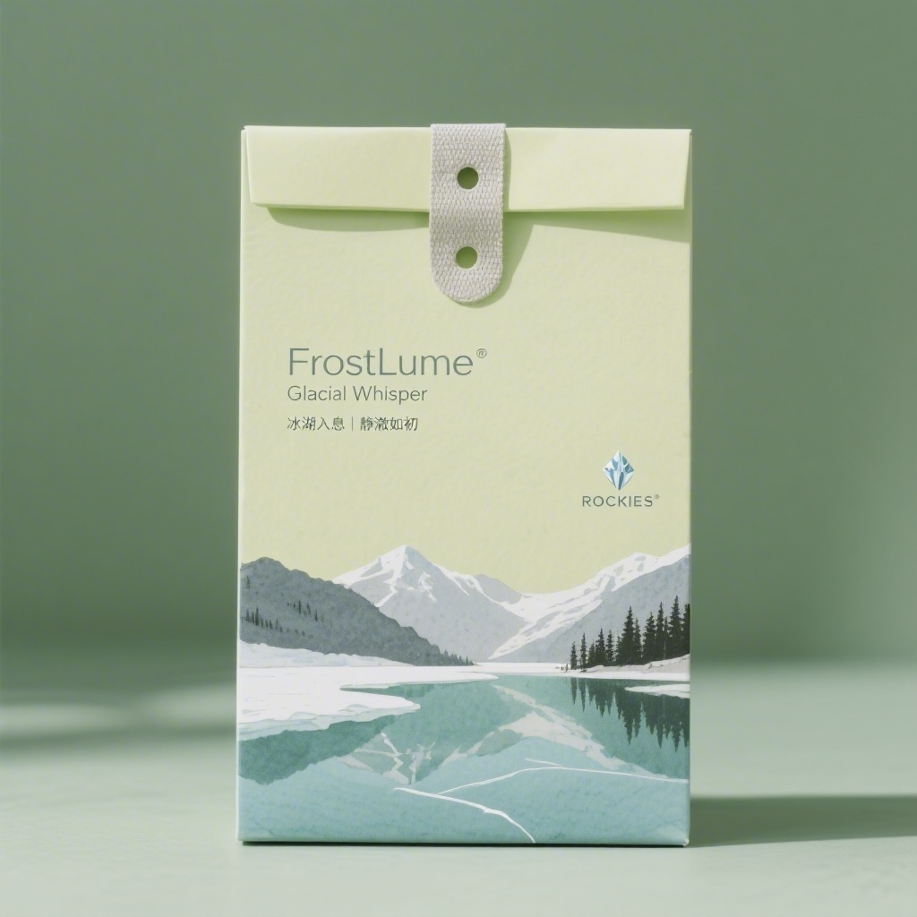 - **包装主视觉面排版**:上下排版(文字在上图案在下),上半部11.5cm垂直居中排布主标题“FrostLume”与副标“Glacial Whisper”,使用极细现代无衬线字体;其下8pt宋体双行短句“冰湖入息|静澈如初”轻落于标题正下方,字号差达5倍;下半部11.5cm内满绘清冷冰川湖——灰蓝绿调水彩晕染、薄墨山脊、霜白倒影,湖岸隐现冷杉剪影,图文间以0.8mm霜白细线优雅过渡,视觉重心下沉营造静谧纵深感