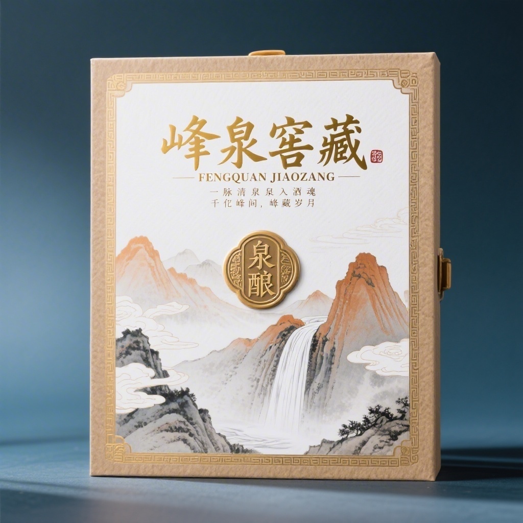 产品为高端白酒,品牌名为峰泉窖藏,包装样式为牛皮纸精品礼盒,纸面呈天然粗纹质感;包装营销卖点以“山泉淬酿,峰藏岁月”为核心,突出水源地与陈酿价值;主视觉采用上下排版,上部为烫金大字“峰泉窖藏”配拼音“FENGQUAN JIAOZANG”,字体为隶书变体36pt,下部为24pt宋体宣传语“一脉清泉入酒魂”+“千仞峰间藏醇香”;背景层为渐变灰蓝水墨晕染,主图案是工笔风格层叠山峰与飞流瀑布,山体用淡赭石勾勒,水流施以留白飞白技法,辅以云雾缭绕装饰纹,四角压印暗金色回纹边框,中央悬浮圆形篆章图标内刻“泉酿”二字;设计风格融合东方山水意境与现代极简留白,主题配色为主色玄青、辅色砂金。